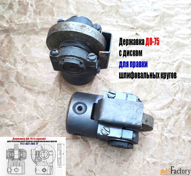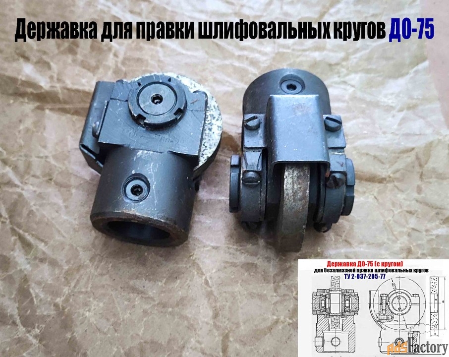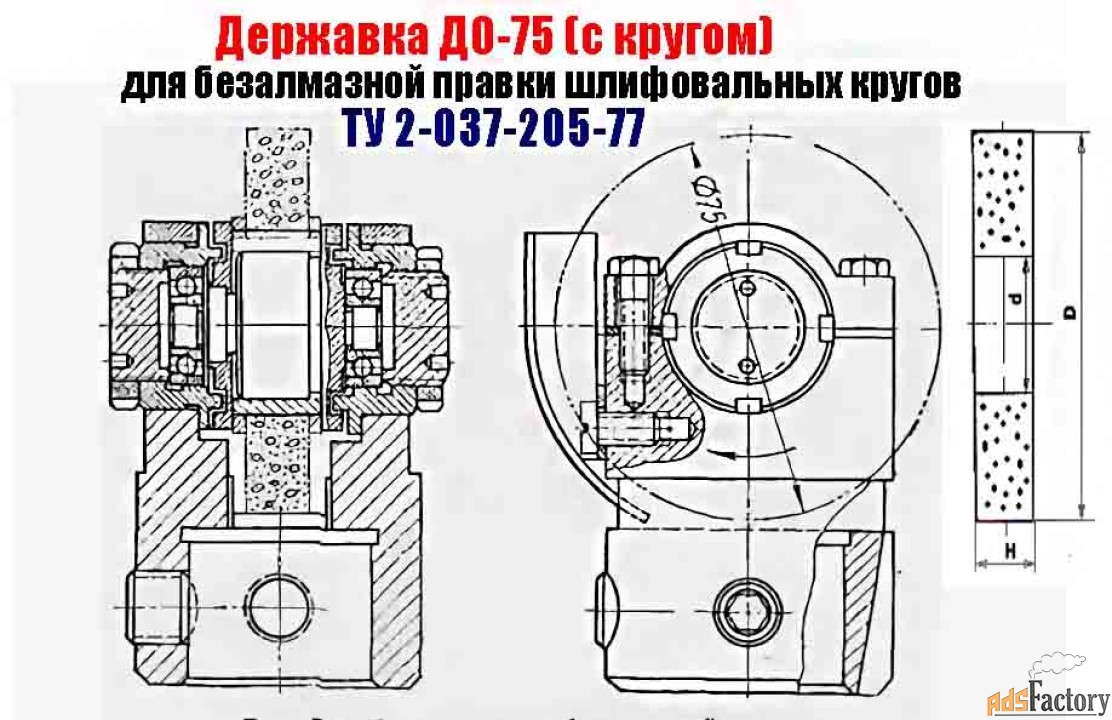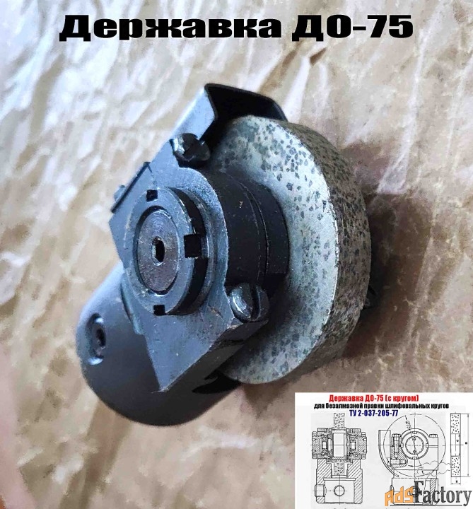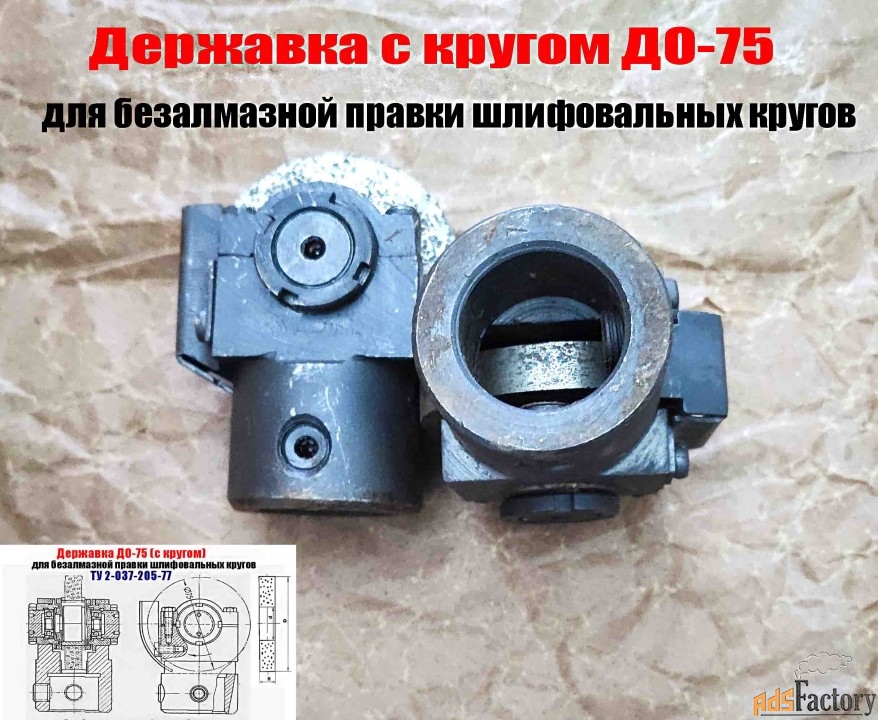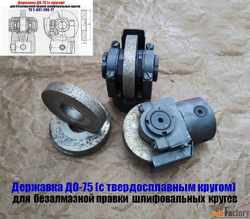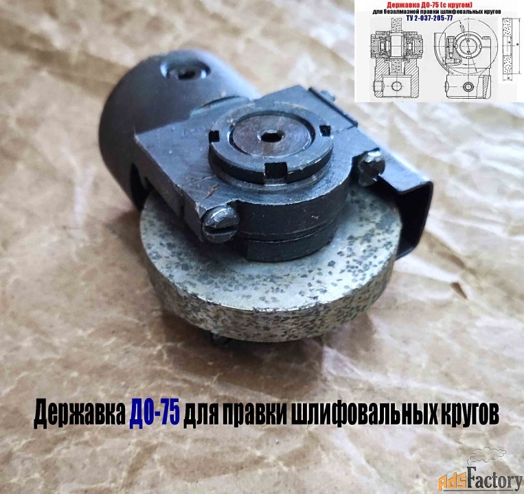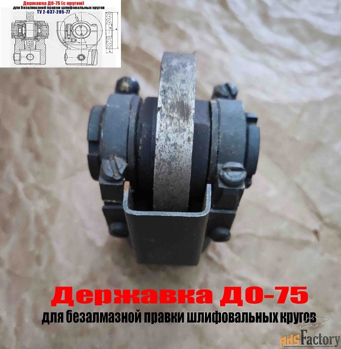 Державка ДО-75 (собранная на подшипнике качения) с диском из зерен твердого сплава предназначена для безалмазной правки методом обкатки на плоскошлифовальных и круглошлифовальных станках кругов диаметром до 600 мм, зернистостью от 40 до 80, твердостью от М1 до СТ2, на керамической и бакелитовых связках.