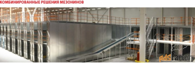 Мезонин на рамах представляет собой многоуровневые высокие полочные стеллажи разделенные по высоте межэтажными перекрытиями (настилами), оснащен перилами, лестницами.