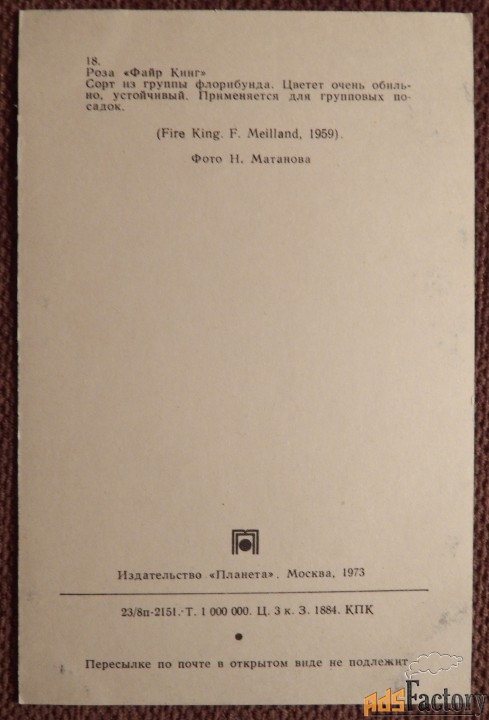 <a target=_blank title="Открытка. Роза. Сорт Файр Кинг. Цветы. 1973 год" href="https://www.adsfactory.ru/hobbi-otdyh-i-sport/kollektsionirovanie/otkrytki/sankt-peterburg-otkrytka-roza-sort-fajr-king-tsvety-1973-god-SPT-894311764353682">Открытка. Роза. Сорт Файр Кинг. Цветы. 1973 год</a>