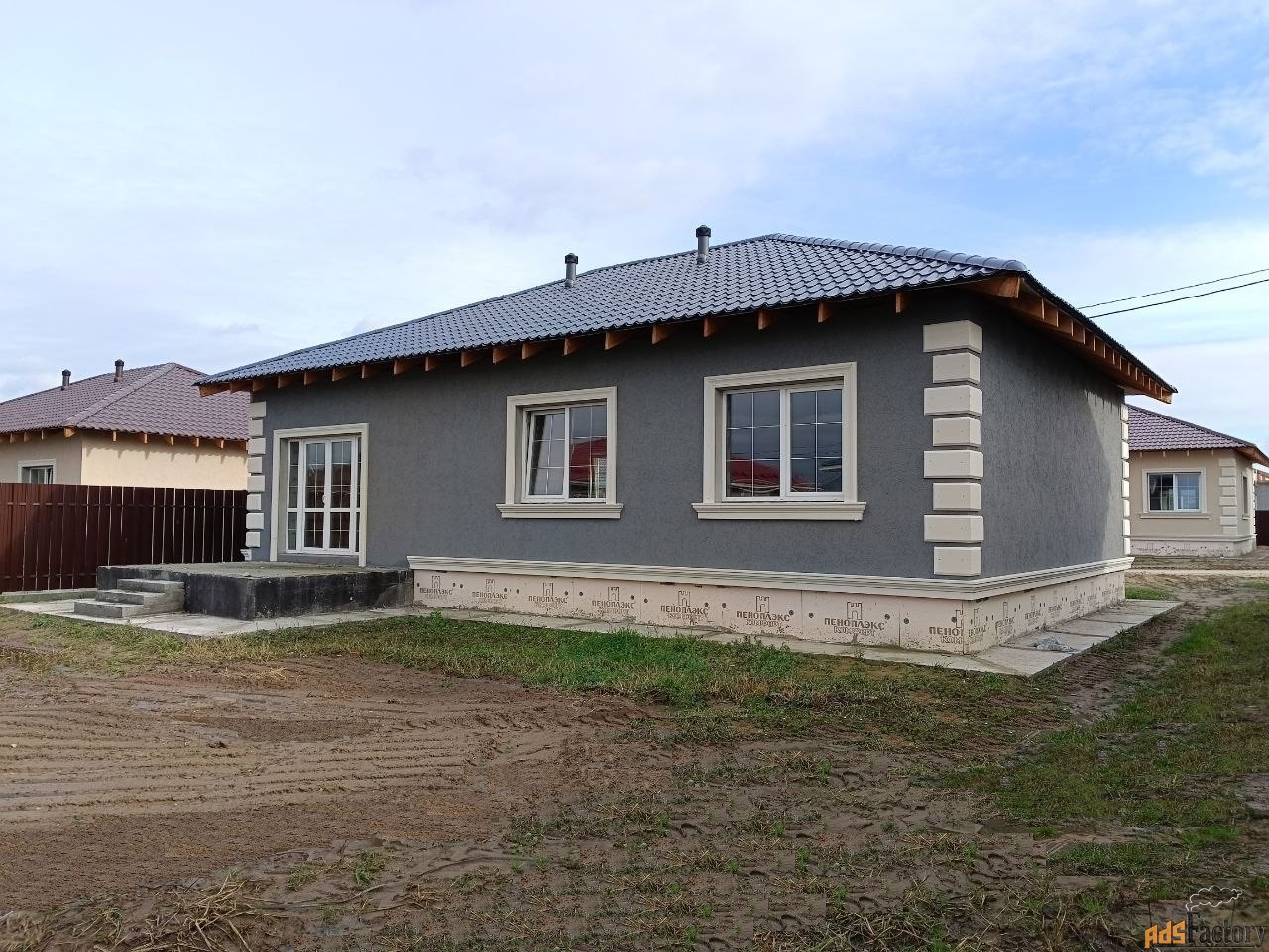 - Фасад: Штукатурка, покраска, фасадный декор; Цоколь утеплен и облицован термопанелями; выполнена отмостка;