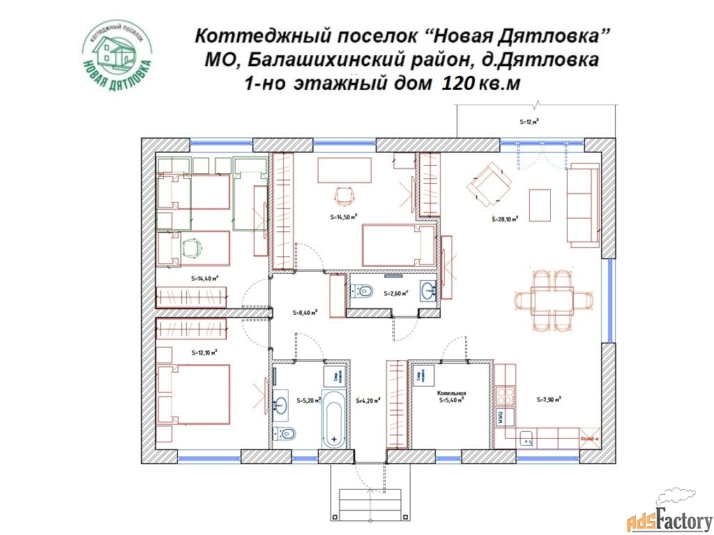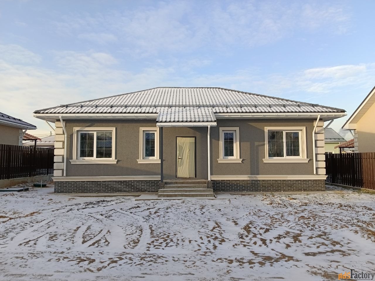 Просторная кухня-гостиная 36 кв.м с окнами на три стороны света и панорамной дверью на крытую террасу 12 кв.м; три изолированные комнаты (12/14/14 кв.м), ванная комната, бойлерная, гардеробная, прихожая, гостевой с/у.