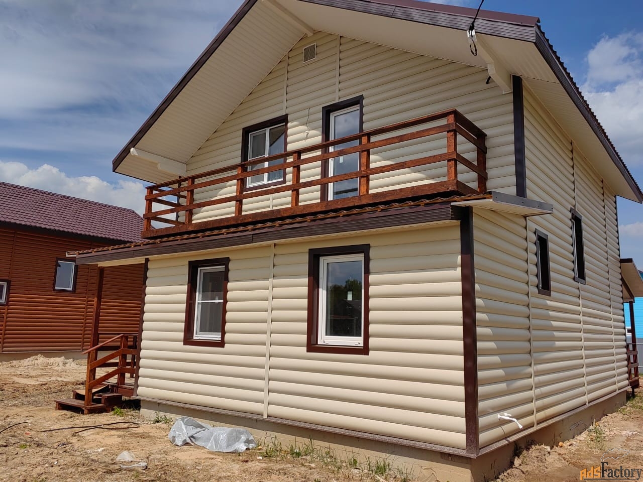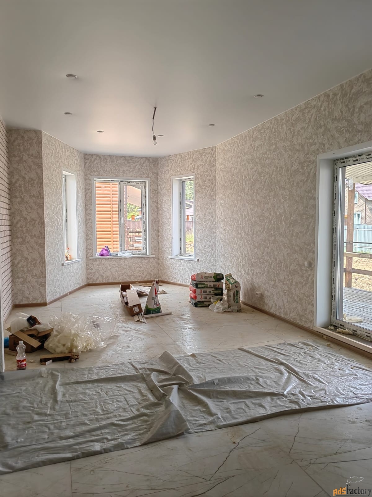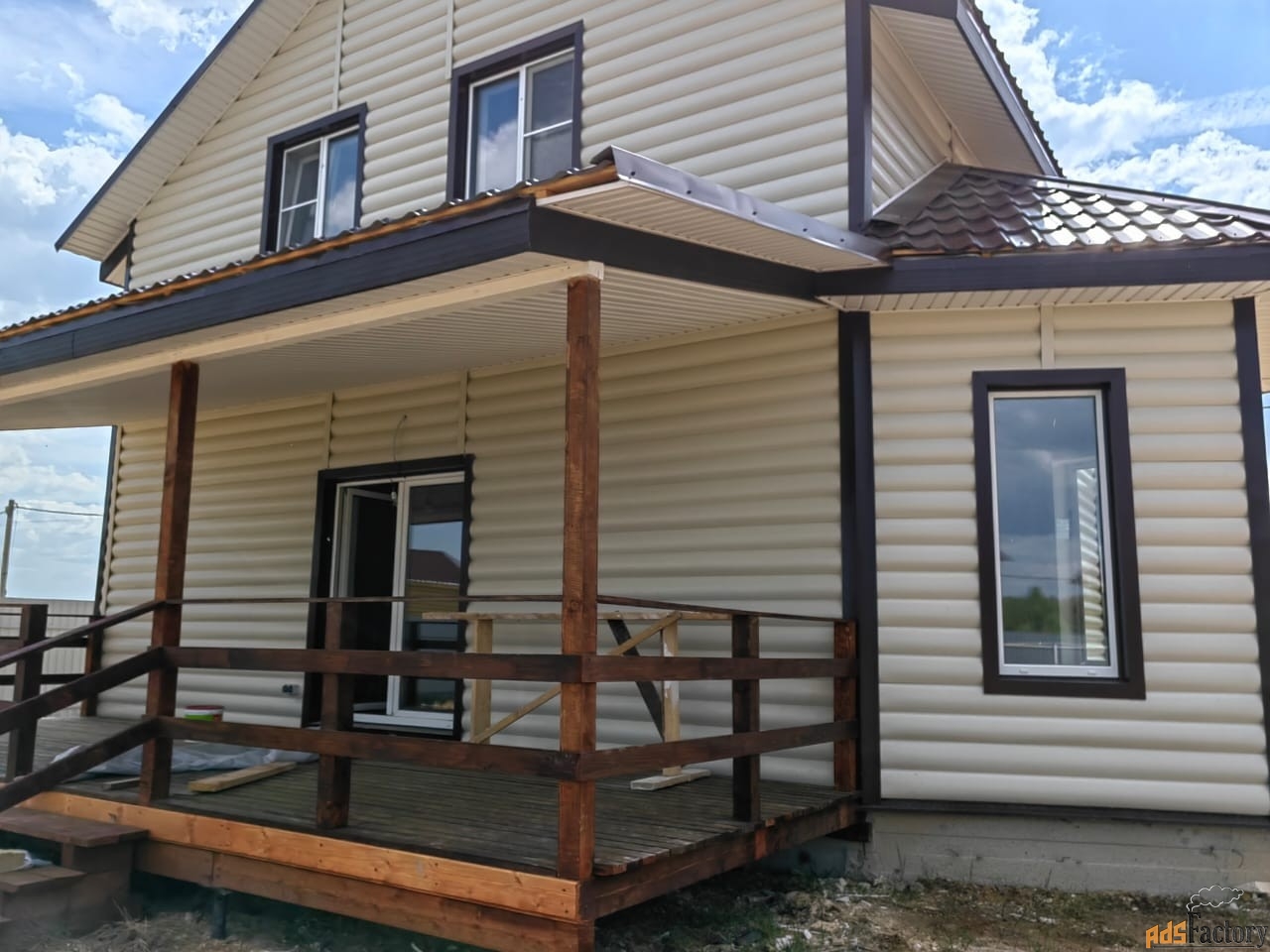Материал стен – пеноблок , утепление пола и крыши 150 мм, отделка наружная сайдинг; внутри штукатурка. Под обои. Крыша – метало черепица. Натяжной потолок. Ламинат на полу. Хорошие двери.