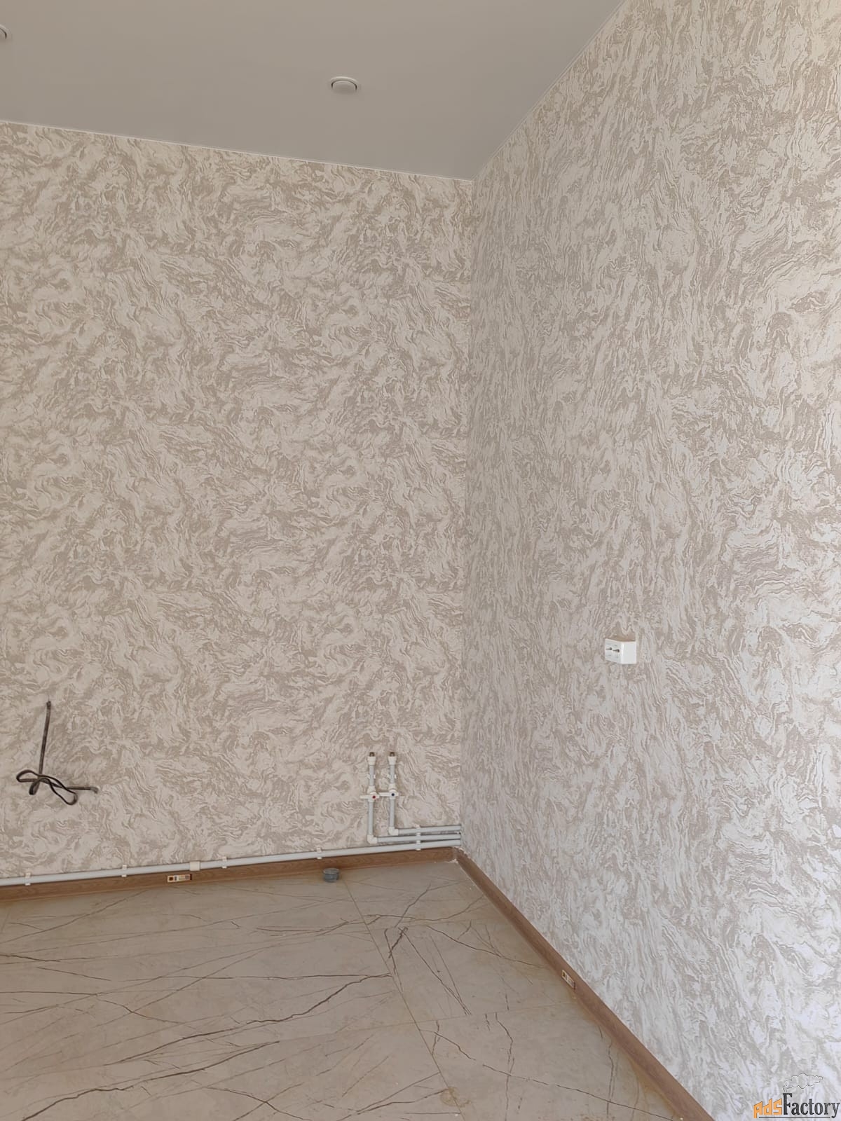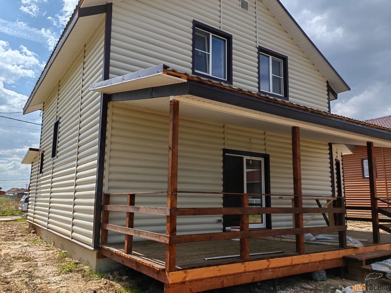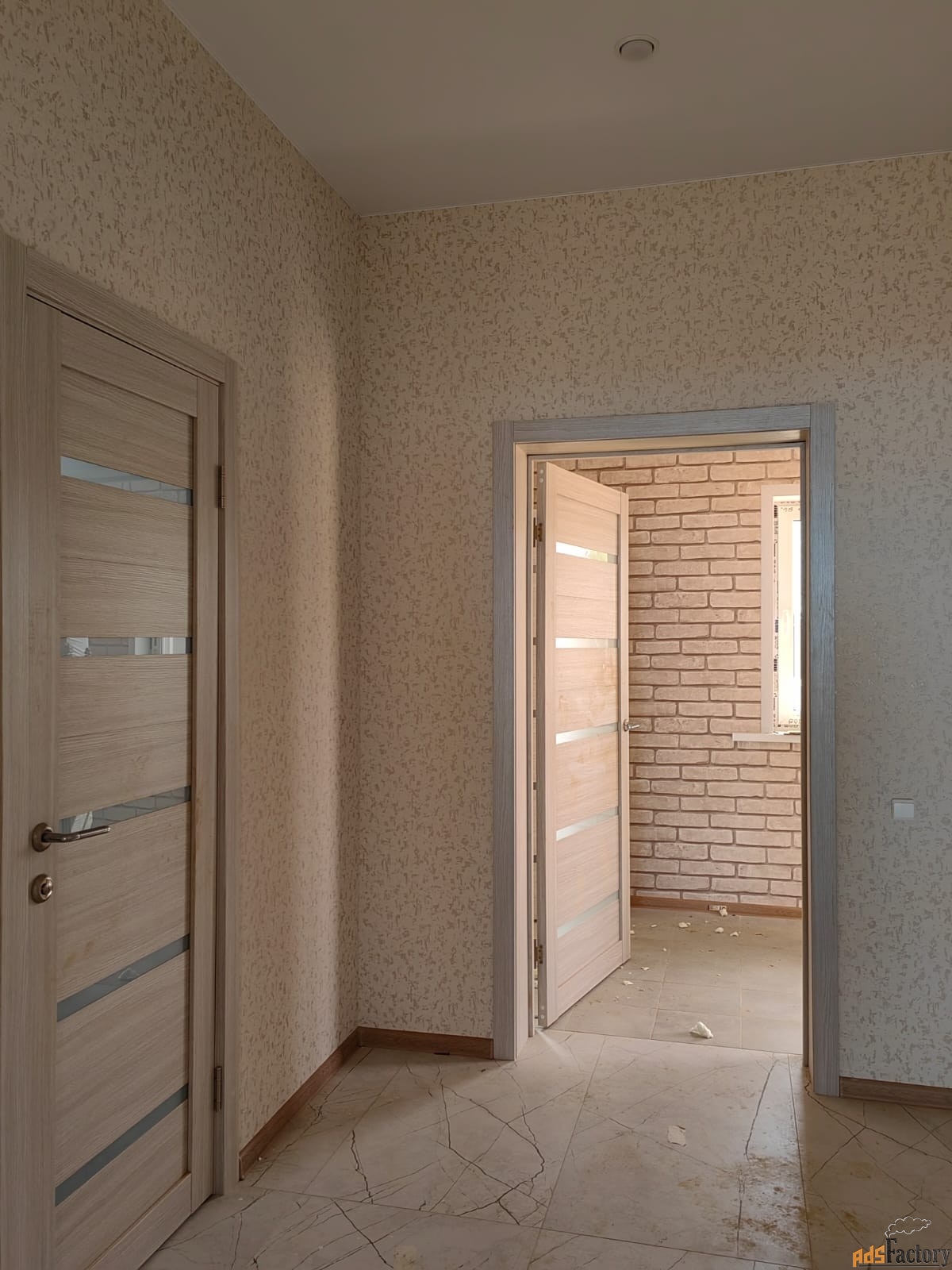 Материал стен – пеноблок , утепление пола и крыши 150 мм, отделка наружная сайдинг; внутри штукатурка. Под обои. Крыша – метало черепица. Натяжной потолок. Ламинат на полу. Хорошие двери.