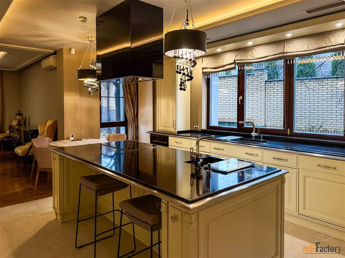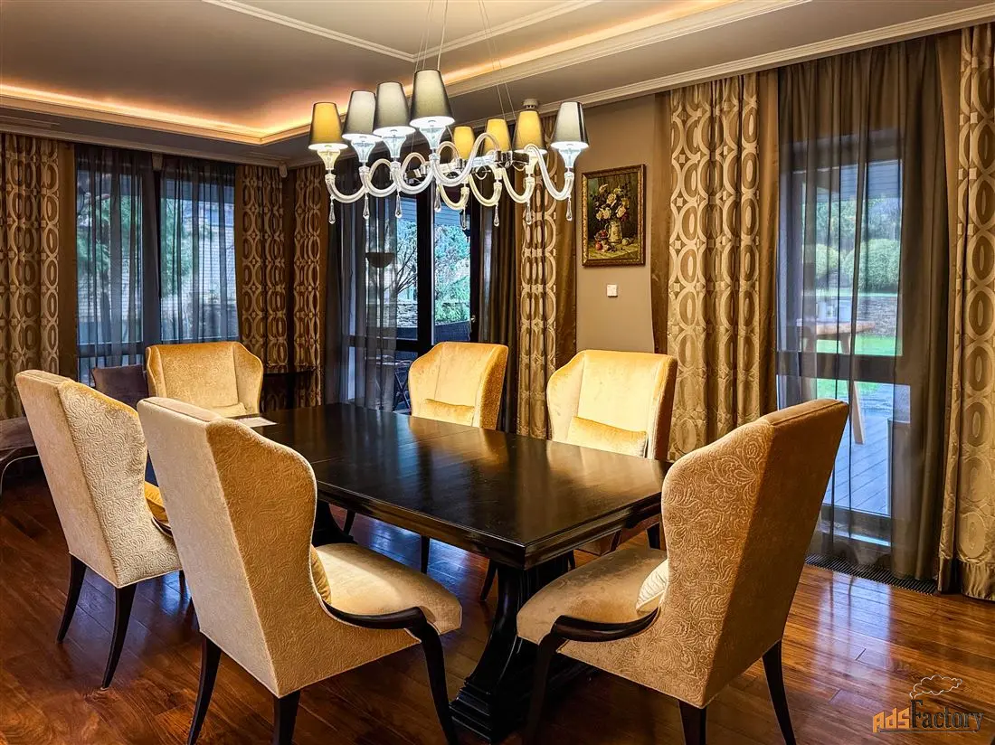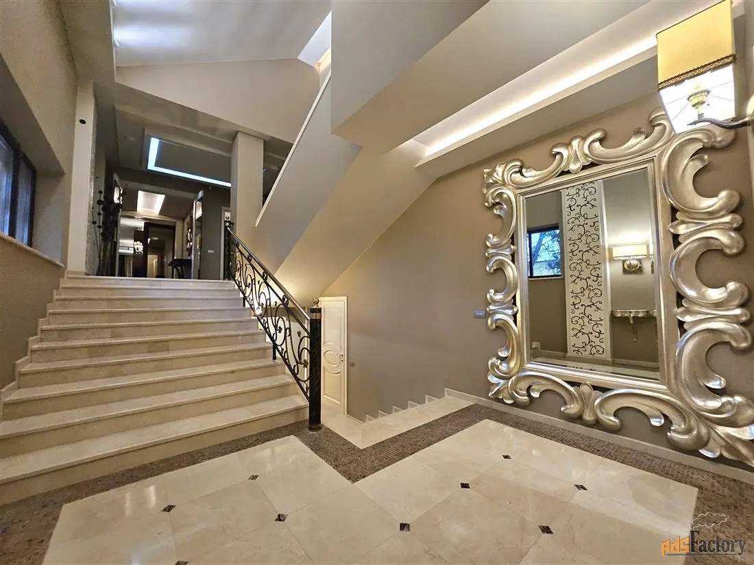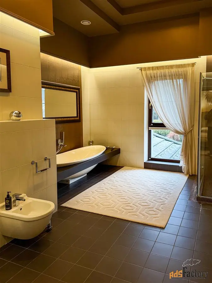 Особая гордость дома — спа-зона, отделанная испанским мрамором: просторная сауна, джакузи итальянского производства. Для досуга предусмотрен кинотеатр. Полы в доме натуральный орех, мрамор, шпон дуба. Крыша немецкая черепица (пожизненная гарантия) + лиственница.