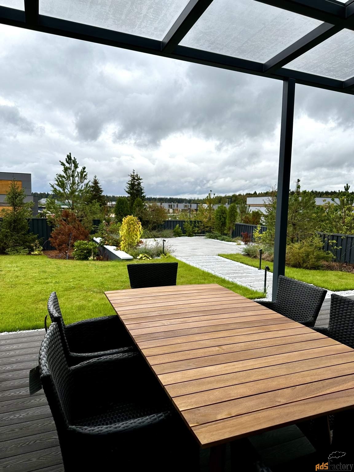 Просторная кухня-гостиная с панорамными окнами с выходом на террасу и участок с ладшафтным дизайном