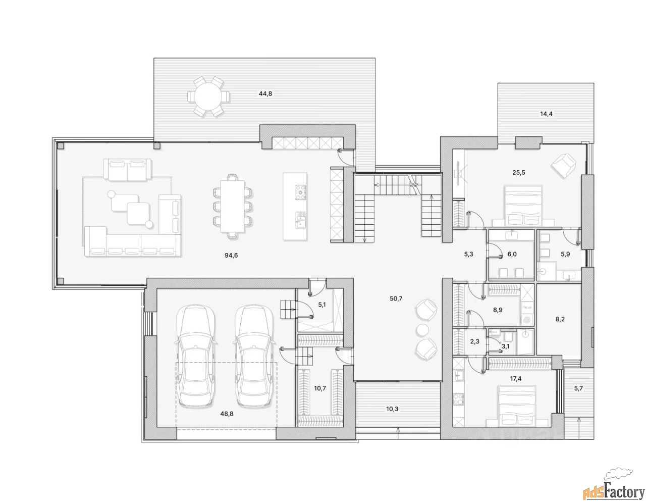 Дом сдается со свободной планировкой (формат shell & core) — внутри нет перегородок и отделки, заведены все инженерные коммуникации. Такое решение даёт полную свободу: можно спроектировать любое количество спален, кабинетов или зон отдыха, выбрать собственный стиль интерьера и создать пространство, идеально подходящее под ритм жизни вашей семьи.