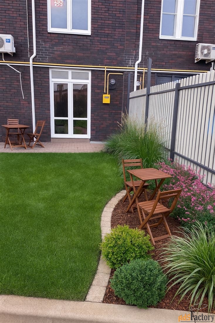 Площадь таунхауса 79 кВ м + 30кв м эксплуатируемая кровля + терраса , частично под навесом. 2 сан узла, просторная кухня-гостиная и 2 уютных спальни.