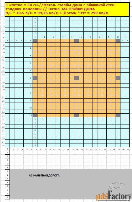 Максимальное пятно застройки дома: 9,5*10,5 п/м=99,75 кв/м 1 этаж, 3 эт.= 299 кв/м нового дома + чердак 95 м2;