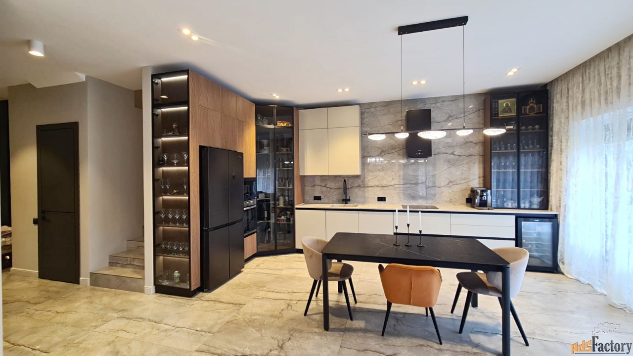 ДОМ: Двухэтажный дуплекс 186 квадратов с тремя просторными спальнями, 3 санузла и с 3 гардеробными. Большая кухня-гостиная с панорамным остеклением на веранду. Большая уютная веранда как продолжение зоны отдыха на участке. Санузел на каждом этаже. Гараж на один автомобиль. Выполнен дизайнерский качественный ремонт для собственного проживания из дорогостоящих материалов. Дизайн в уютном современном стиле в светлых тонах. Фасад отделан деревом. Было выполнено дополнительное утепление и звукоизоляция. Вся мебель и техника остается по согласованию. Фундамент - шведская утепленная плита, мягкая кровля, лиственница на фасаде, окна и внутренние коммуникации Rehau.