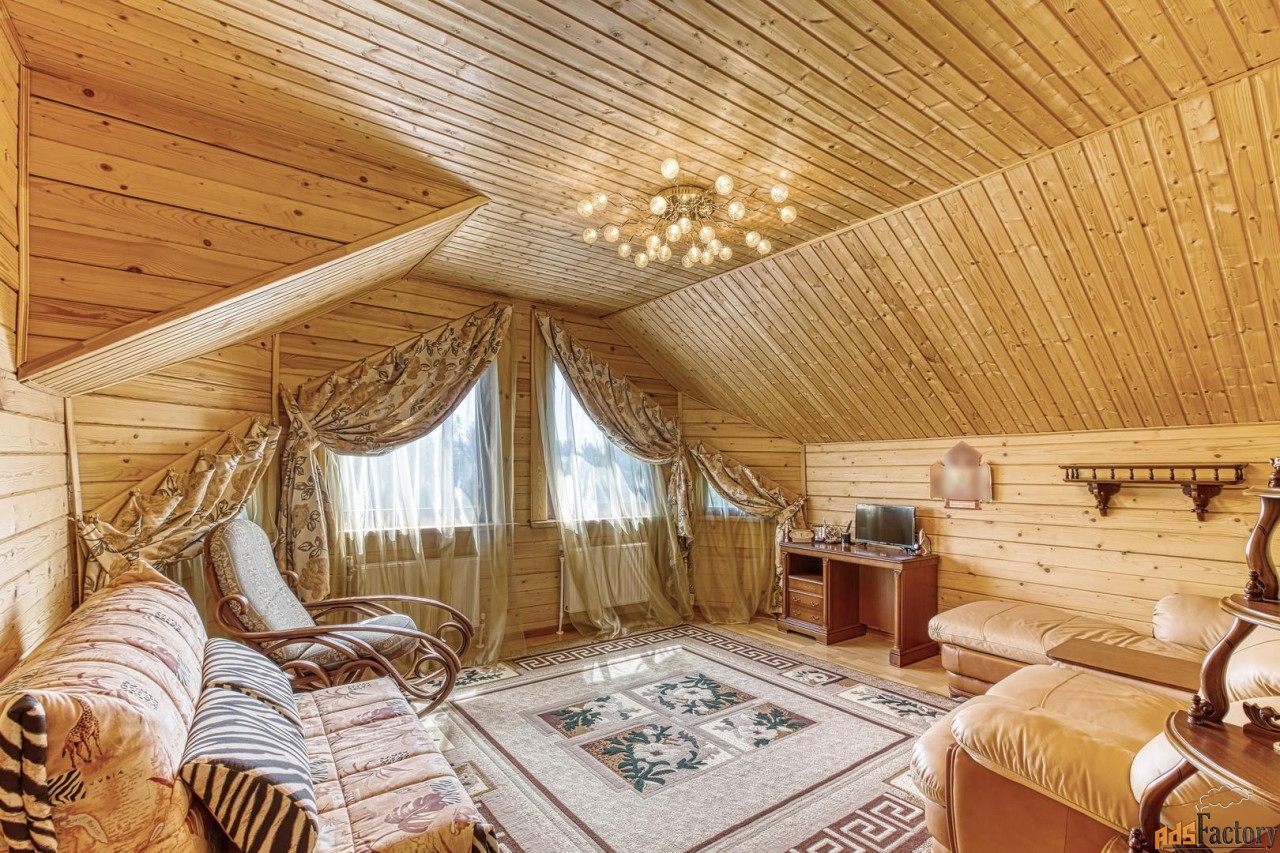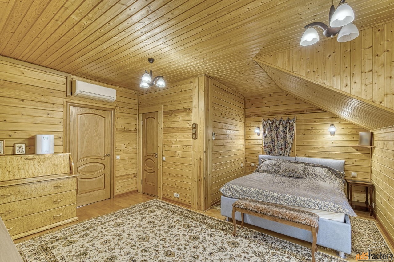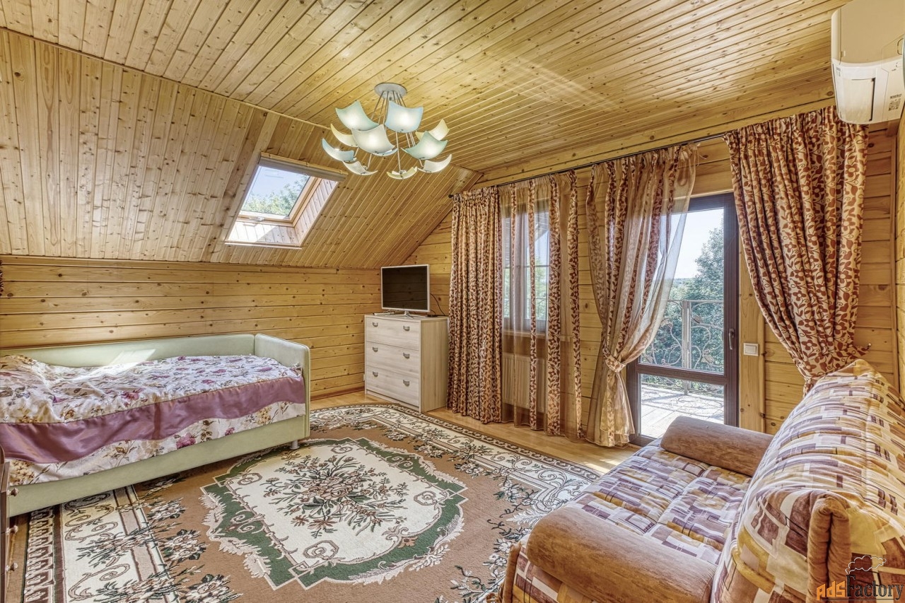 Так же в усадьбе есть гостевой дом из круглого бревна. Дом с четырьмя спальнями на 2 втором этаже и балконом, с видом на пруд. На первом этаже расположена зон отдыха с русским бильярдом, баней (печь дровяная), и купелью. Так же в доме оборудована своя кухня. Выход из гостевого дома прям к пруду. Пруд с рыбой (карпы и толстолобики).