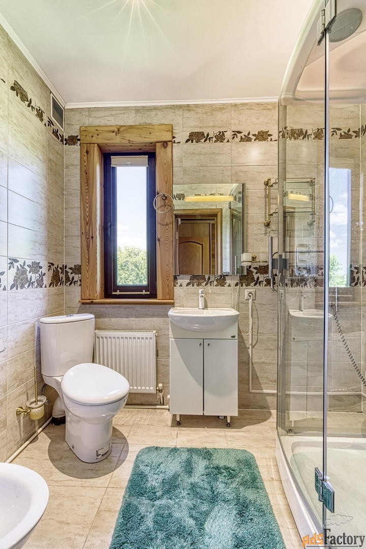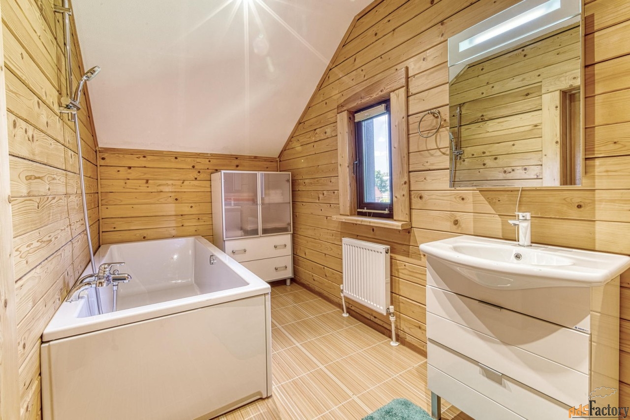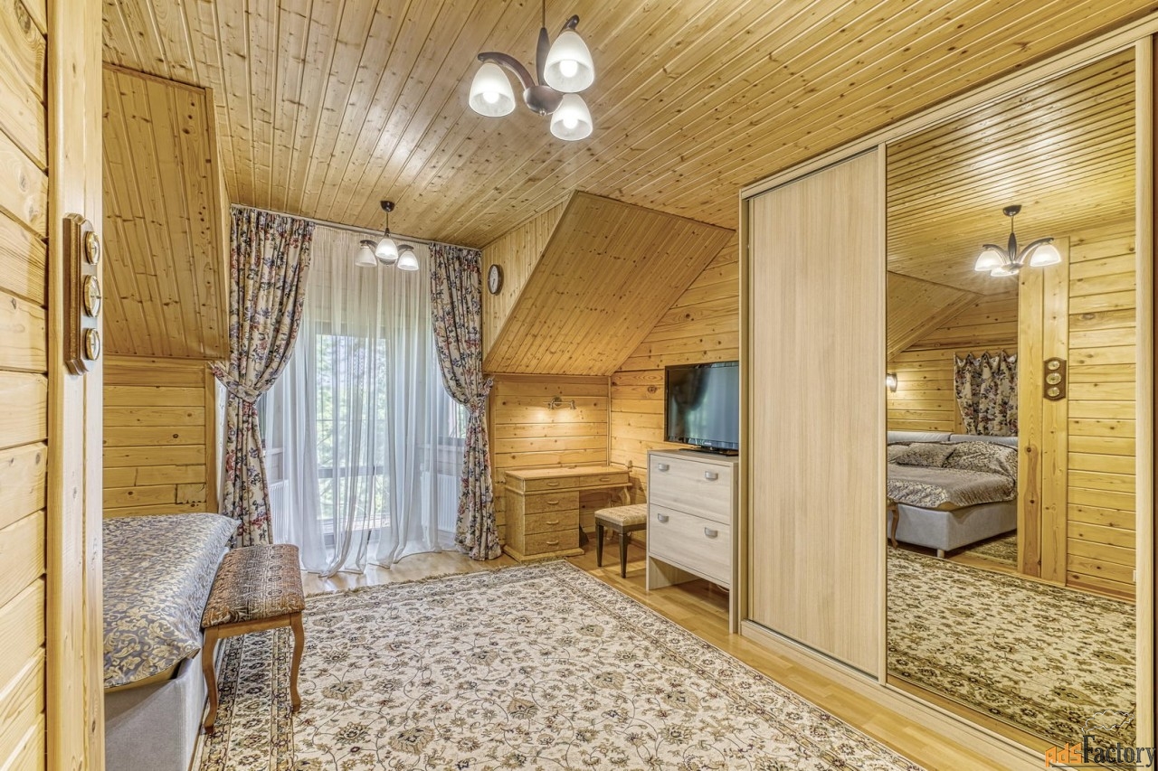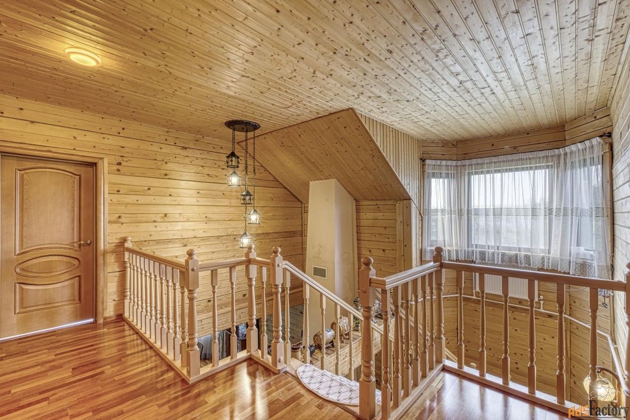 Так же в усадьбе есть гостевой дом из круглого бревна. Дом с четырьмя спальнями на 2 втором этаже и балконом, с видом на пруд. На первом этаже расположена зон отдыха с русским бильярдом, баней (печь дровяная), и купелью. Так же в доме оборудована своя кухня. Выход из гостевого дома прям к пруду. Пруд с рыбой (карпы и толстолобики).
