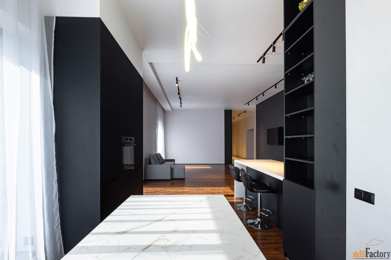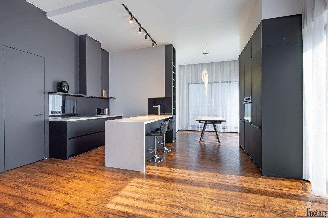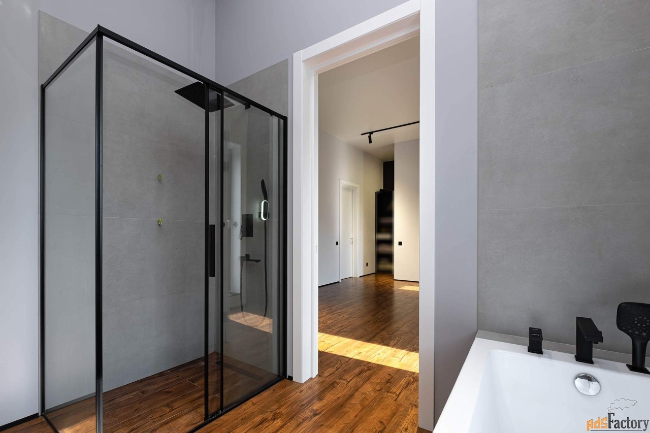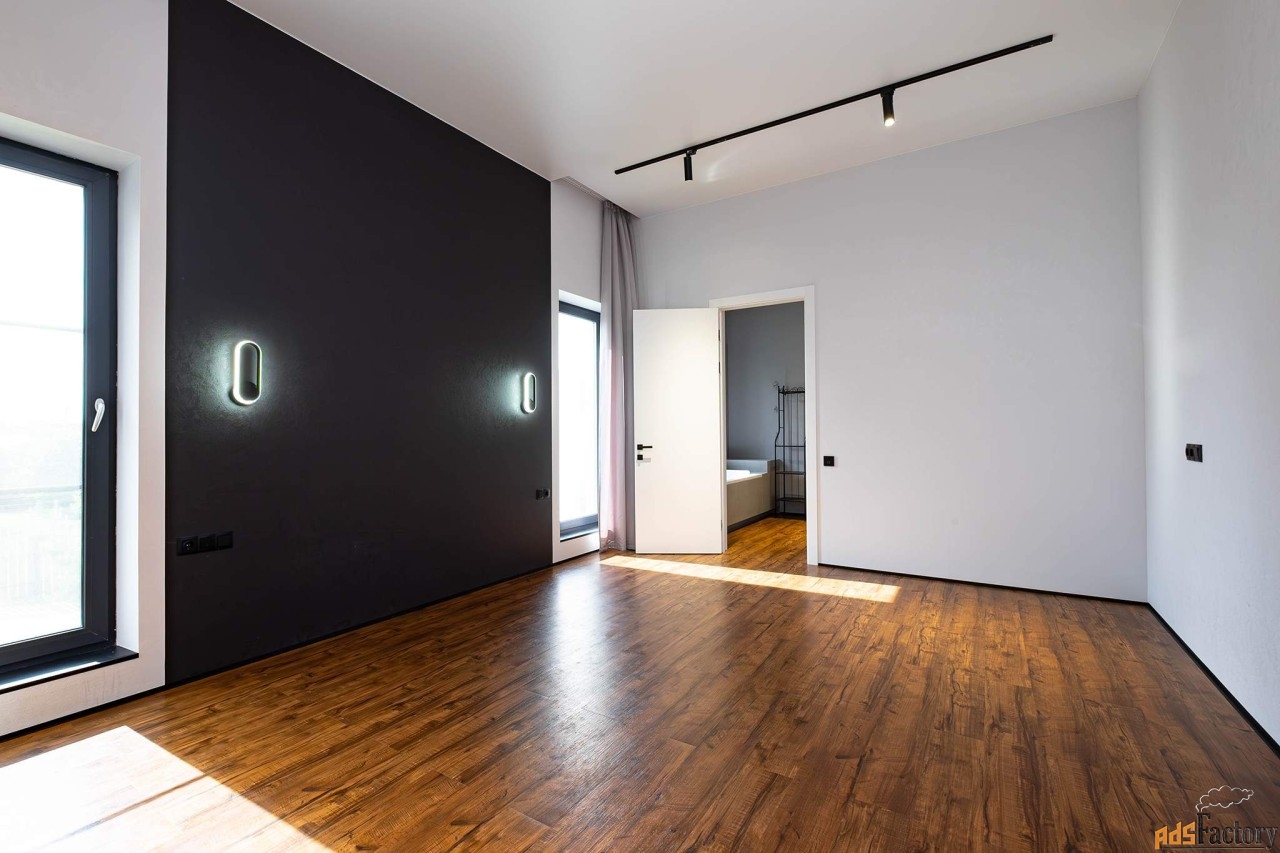 Высокие потолки — 3,4 м, входные двери FALKO (2,4 м) с обогреваемым контуром, бесключевым доступом и обширной подсветкой, межкомнатные — скрытого монтажа.