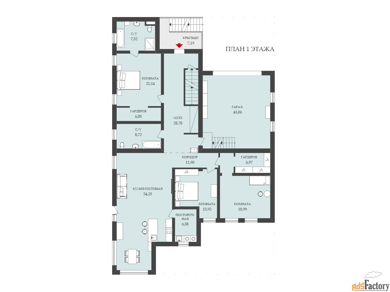 Планировка выполнена в одном уровне и продумана до мелочей: