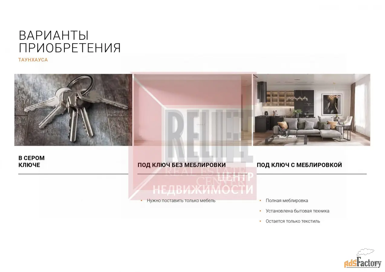 Арт. 100511426 <br> <br> <br>Вы мечтаете о комфортной жизни на побережье, тогда это предложение для Вас!!! <br> <br>Продается таунхаус в клубном жилом квартале \"ПИОНЕРСКАЯ ГАВАНЬ», который расположился в городе-курорте Пионерский по ул. Октябрьская. Современный Пионерский — это городок, славящийся потрясающей красоты морским побережьем, чистым воздухом и ароматным сосновым бором. Вдоль берега идет просторный пляж с мелким белым песком. Это прекрасное место для проживания, семейного отдыха и оздоровления. <br> <br>Таунхаус общей площадью 117.8 кв.м.(торцевая секция) представлен в 3-х этажах: <br> <br>1этаж: просторная кухня-гостиная 28.1 кв.м с выходом на придомовую территорию, холл 9 кв.м, гостевой санузел 4.87 кв.м. <br> <br>2 этаж: спальня 14.2 кв.м, комната отдыха 21.4 и ванная комната. <br> <br>3 этаж: спальня 22.1 кв.м, санузел с душевой. <br> <br>Автономное газовое отопление, все коммуникации центральные, отделка «White box». <br> <br>• Выровненный бетонный пол, уже подготовленный под любое финишное покрытие, включая ламинат, паркет. <br> <br>• Установлены оконные блоки с подоконниками, с выровненными откосами. <br> <br>• Выровненные и оштукатуренные стены. <br> <br>• Ровные подготовленные потолки. <br> <br>• Готовая система отопления. <br> <br>• Разведённая от электрощитка проводка по всем комнатам. <br> <br>• Монтаж входной двери. <br> <br>• Выполнены все сантехнические манипуляции, обустроены водопровод и канализация. <br> <br>Стены дома выполнены из газоблока марки «AeroBlock» прочностью 400D, который являются идеальным строительным материалом для возведения высокоэнергоэффективных домов, благодаря своей особой структуре характеризуется более высоким поглощением звука. Газосиликат является минеральным, нетоксичным и экологически чистым строительным материалом. Перекрытие этажей -плиты перекрытий. Лестницы монолитные железобетонные. <br> <br>Комбинированная облицовка фасада: штукатурка и керамическая плитка «KING KLINKER», декоративные элементы с кварцевым покрытием. <br> <br>Крыша: фальцевая кровля-металл с порошковым покрытием, подшивка кровли- металлические софиты с текстурой дерева. <br> <br>Подоконные отливы: керамическая плитка <br> <br>Таунхаус расположен на земельном участке 2.59 сотки в собственности. Территория комплекса полностью огорожена, выполнено мощение дорожек и тротуаров, установлено уличное освещение и проведено озеленение. <br> <br>Объект подходит под ипотеку с господдержкой и сельскую!!! Все виды безопасных расчетов. Полное сопровождение сделки, услуга выездной регистрации без похода в МФЦ. Ваша сделка пройдёт легко и комфортно!