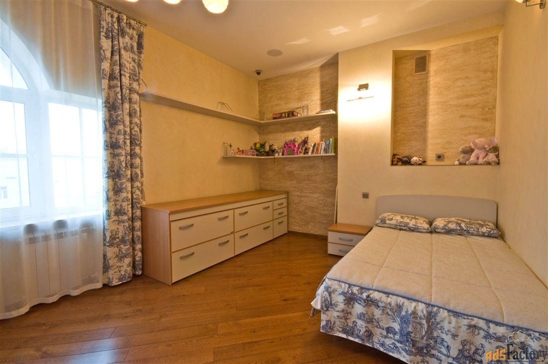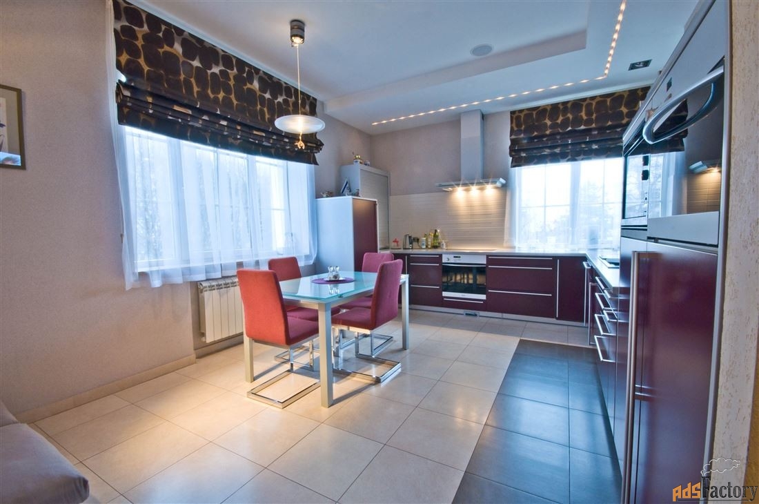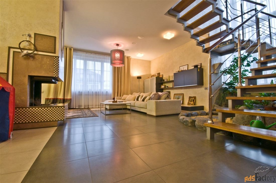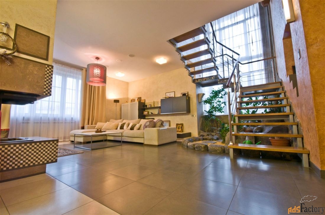 Современный интерьер, укомплектован дизайнерской мебелью и сантехническим оборудованием, мировых производителей. Авторские витражи и роспись на стенах выполнены профессиональными мастерами. Кухня и бытовая техника «Miele».