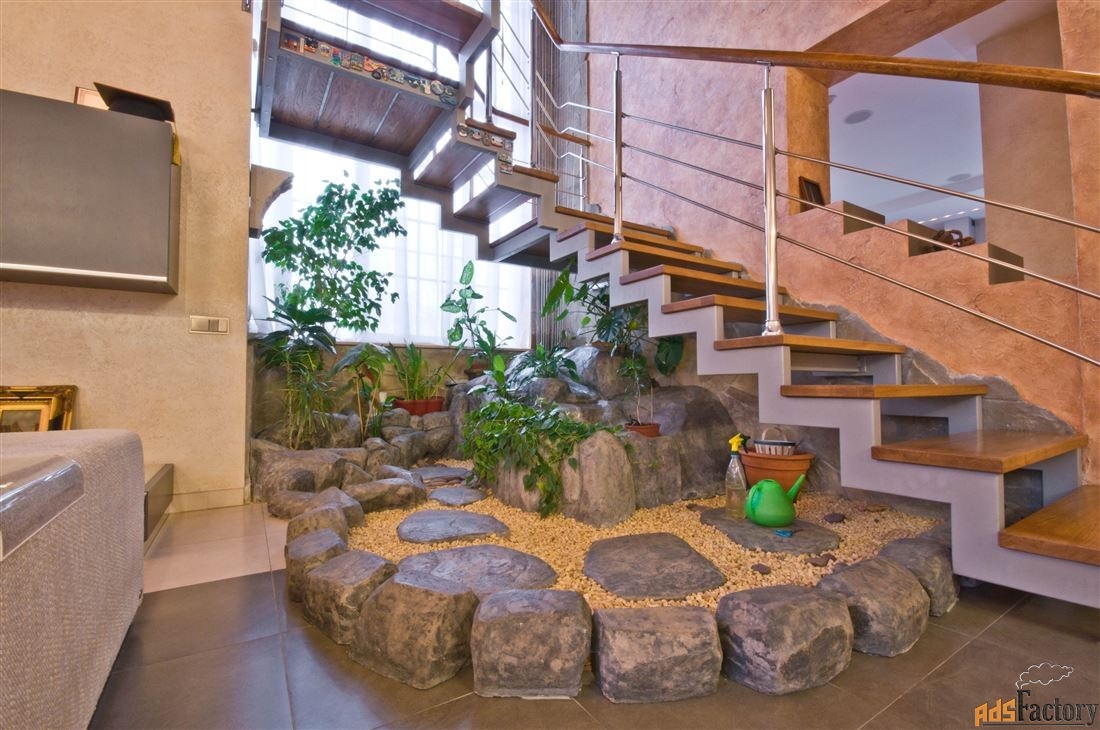 В просторной гостиной с камином оборудован «Зимний сад» с автоматическим поливом растений.