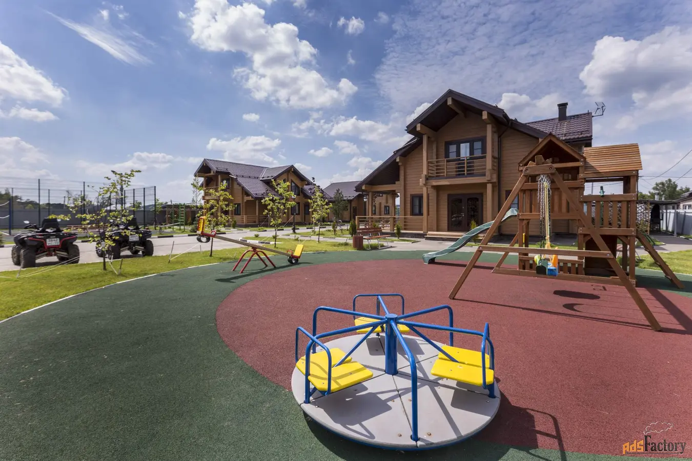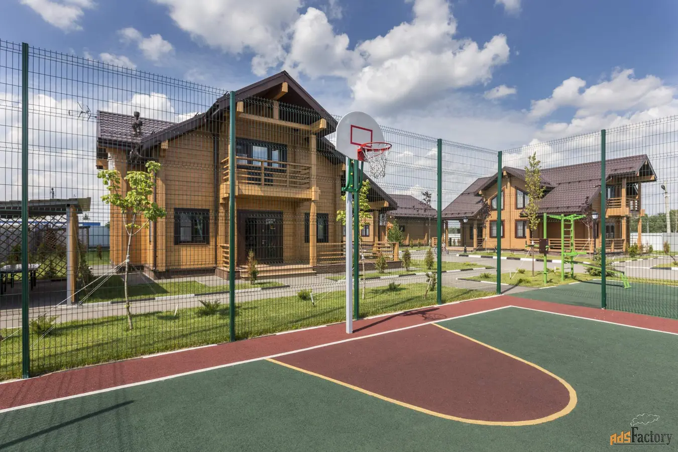 На территории детская площадка, корт для большого тенниса, площадка для игр в волейбол и