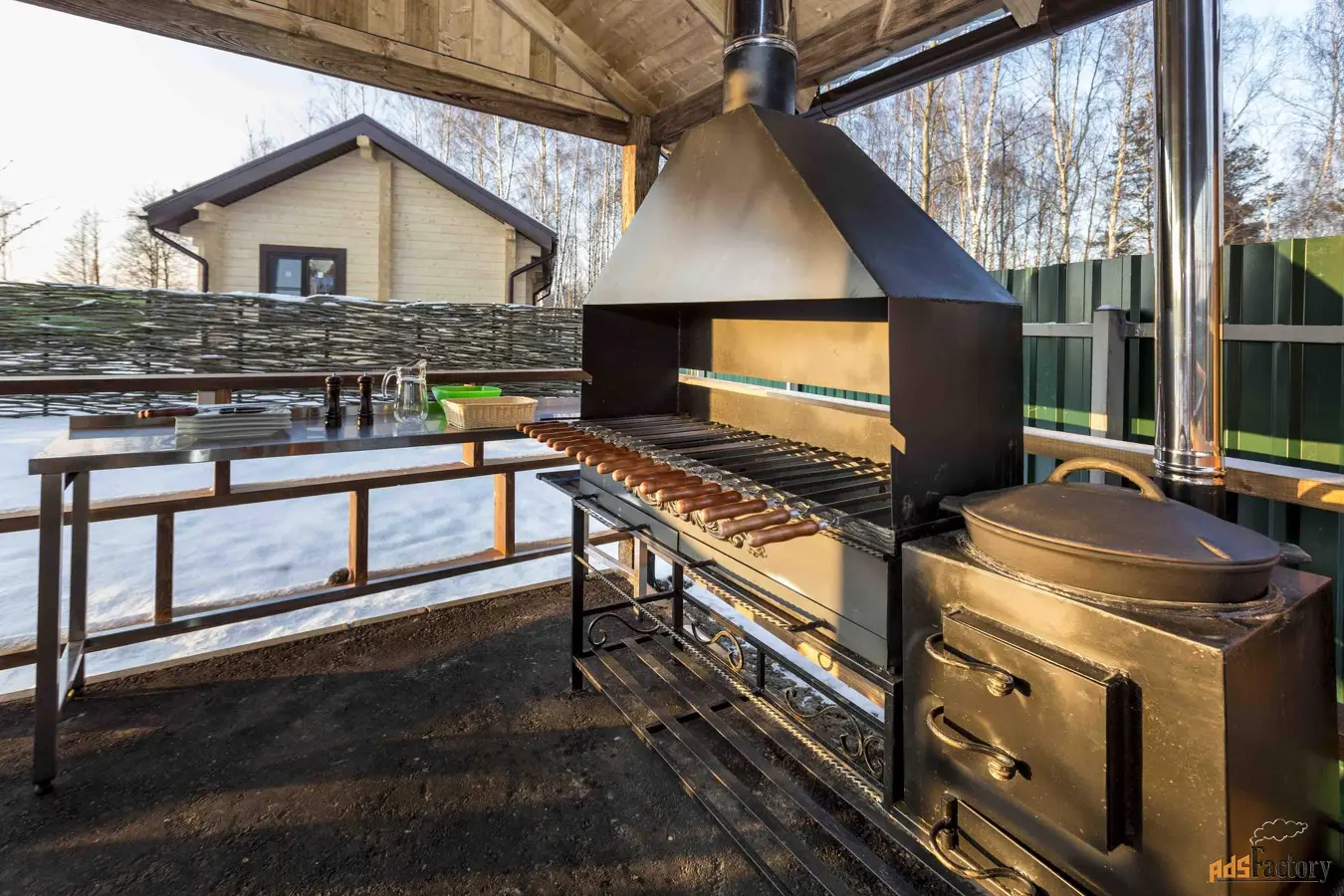 решетка, шампуры , казан предоставляются) разделочным и обеденным столом со стульями.