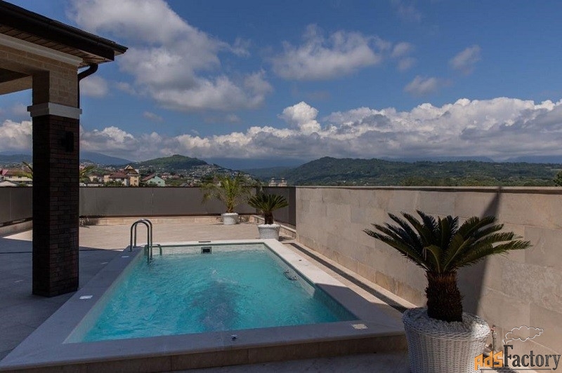 Территория, благоустроенная с ландшафтным озеленением и бассейном.