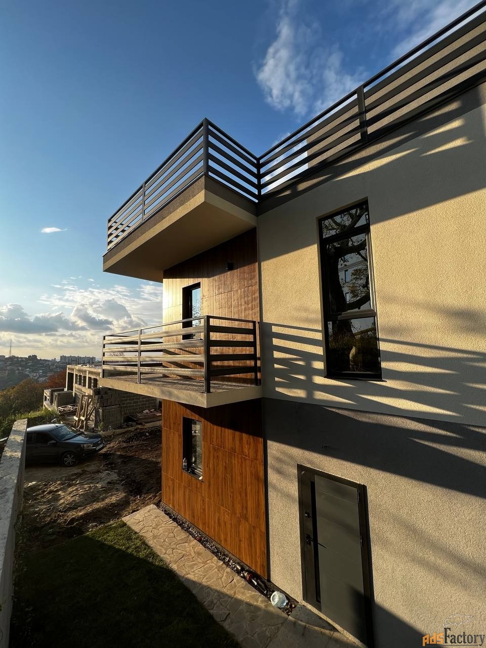 Дом распланирован: 4 спальни, 3 с/у, кабинет, на 2-м этаже большой балкон. Эксплуатируемая кровля с потрясающим видом на море!