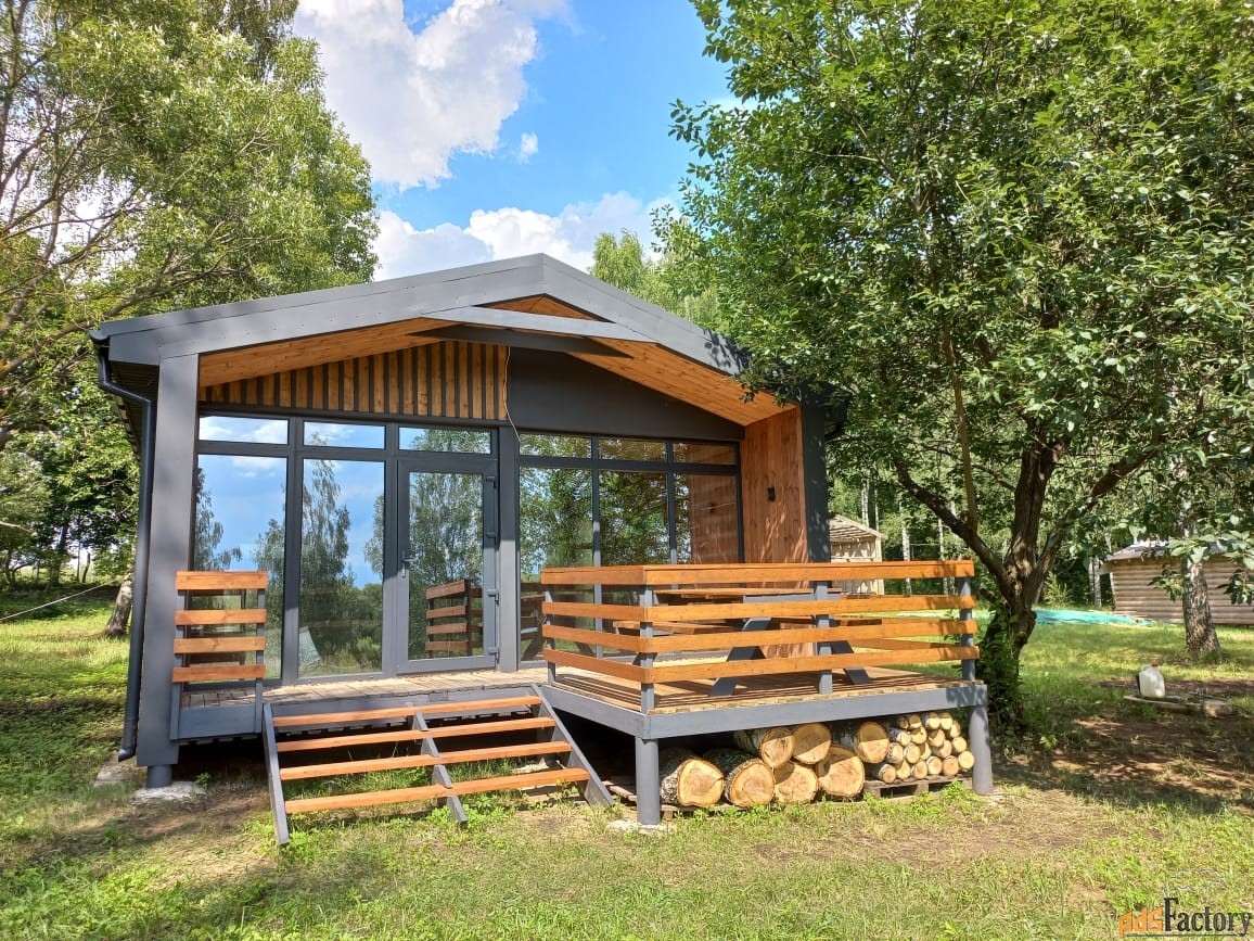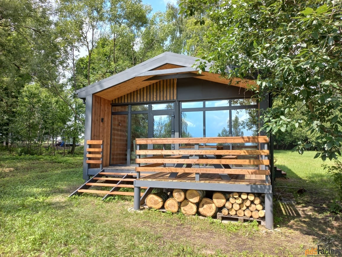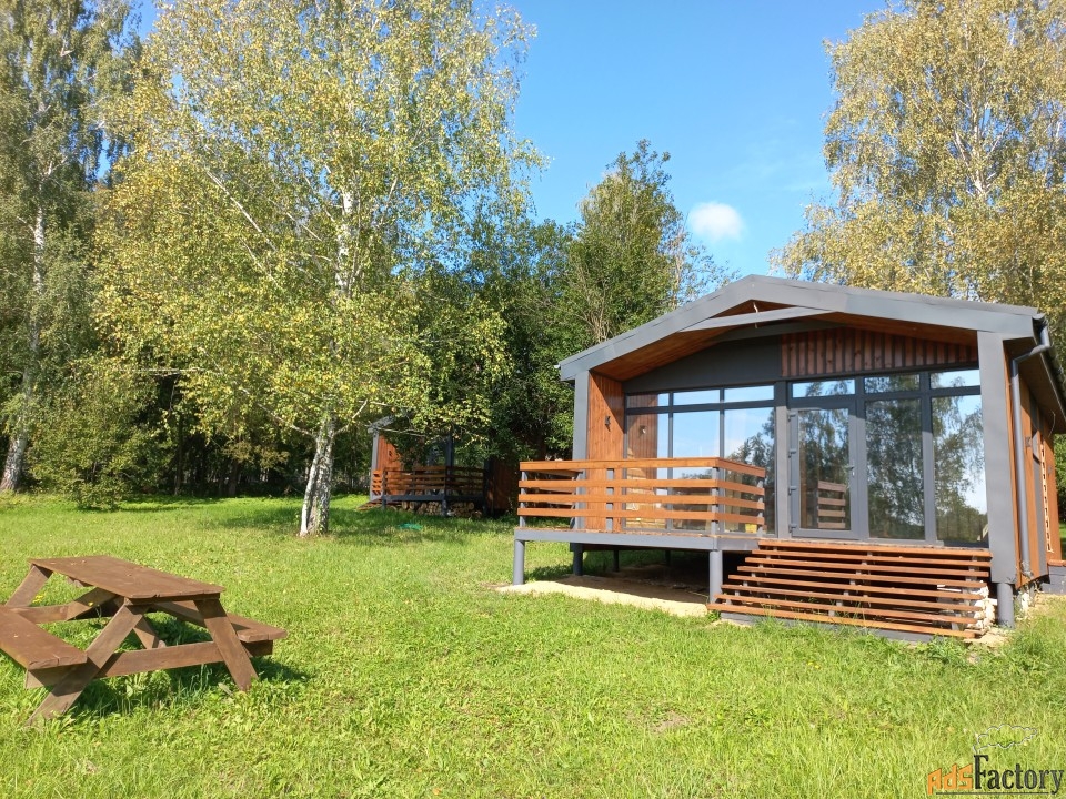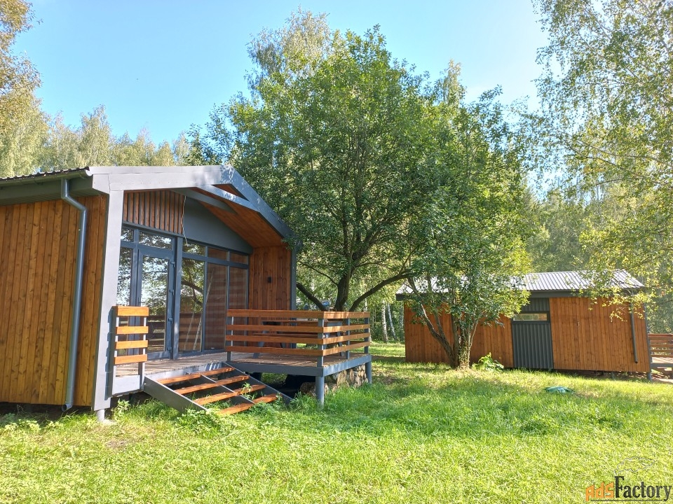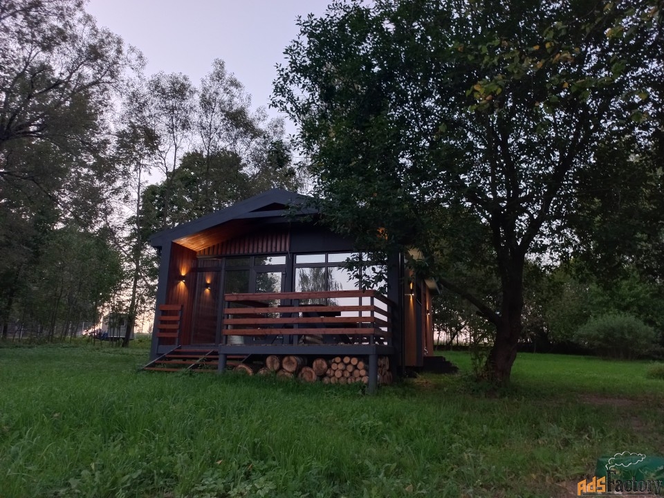 На участке 2,45 Га, премыкающем к водоему в березовой роще располагаются каркасные дома-барн 60 кв.м, с 1 и 2 спальнями, отделка имитация бруса, металлопрофиль антрацит, окна Рехау, утеплитель минеральная вата 150-200 мм, потолки от 3 м. :В 2 х- идет внутренняя отделка , 2 - собран каркас (материалы есть), 1 - сделан фундамент свайно винтовой.