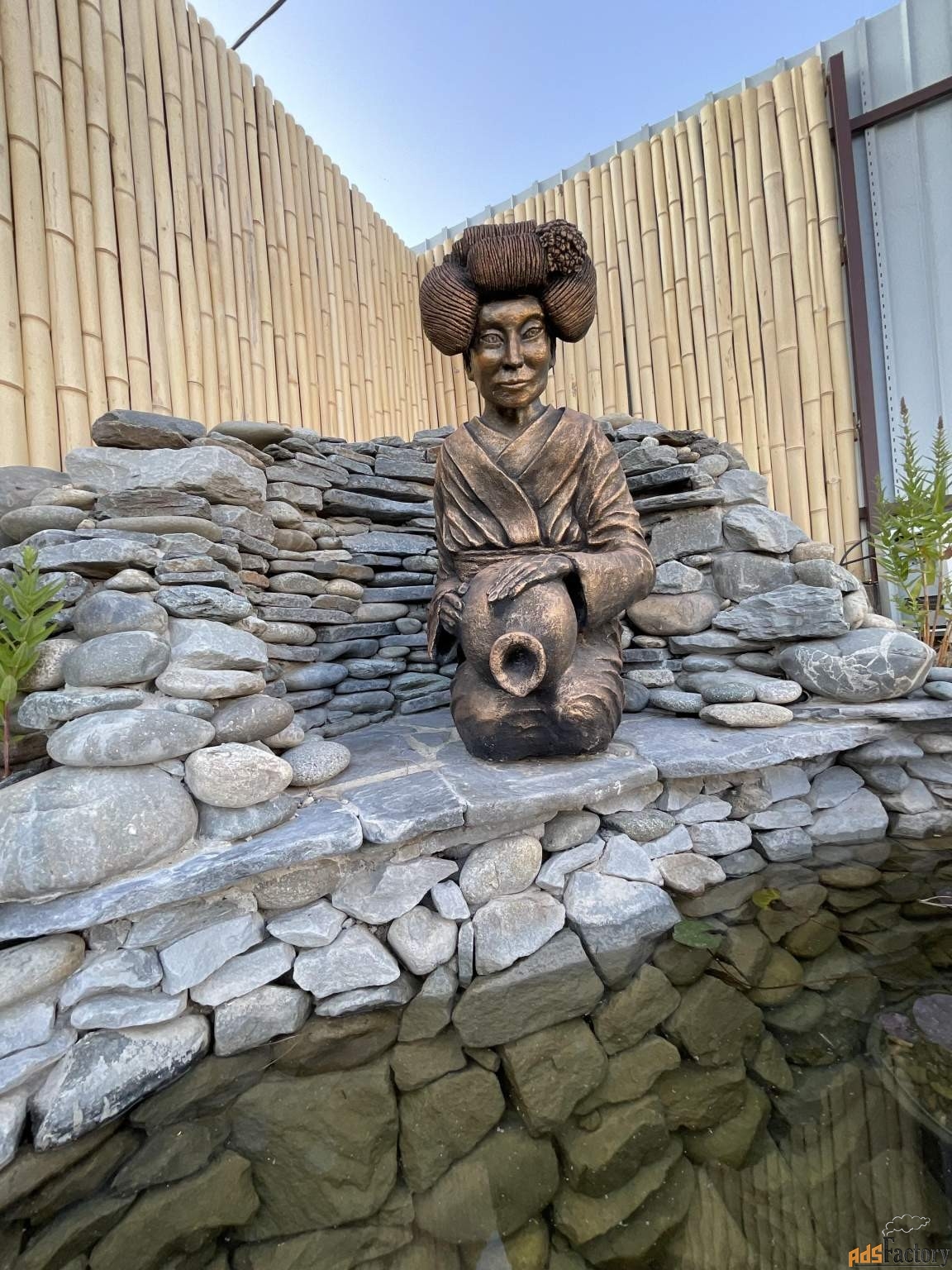 Зона костра с дизайнерской лавкой: круговая скамья со скульптурами сумоистов, расположенная на возвышенности с видом на пруд. Отличное место для детской компании — уединённо, но в поле зрения