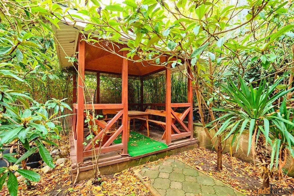 На территории, кроме дома, расположен сад с плодовыми и декоративными растениями, декоративный бассейн, летняя беседка, зона барбекю.