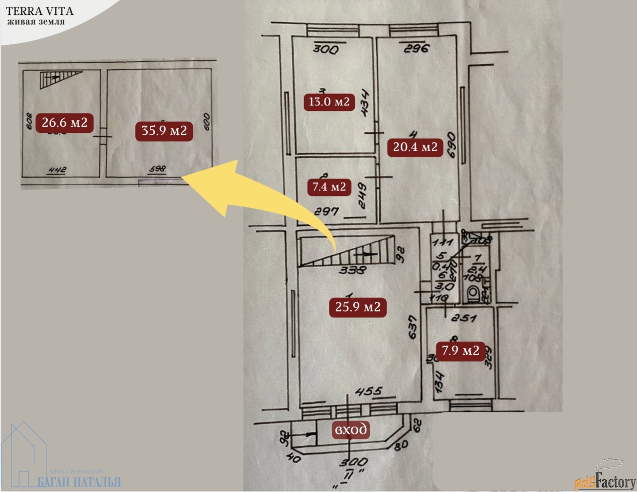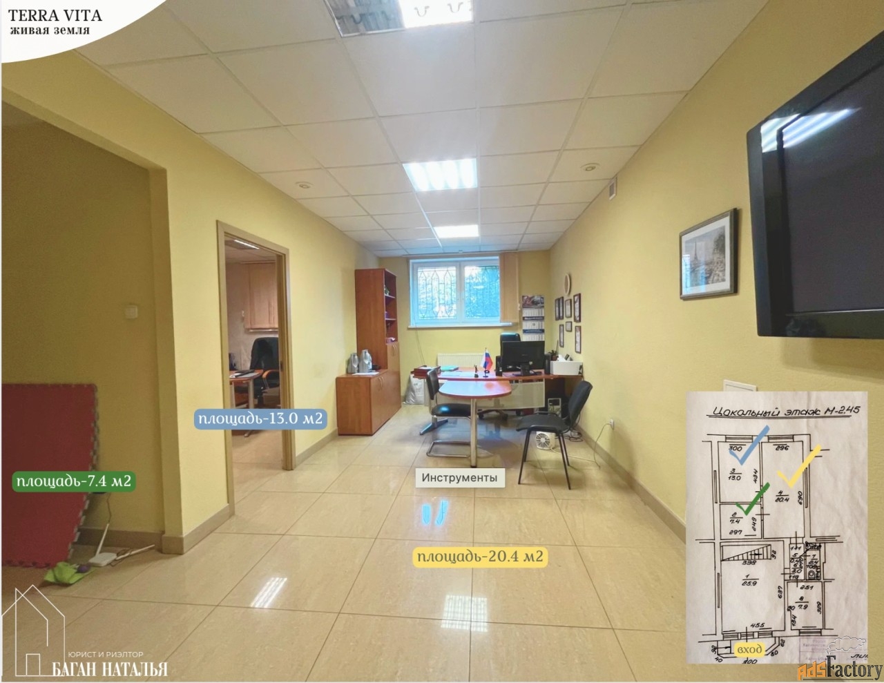 • -помещение с межкомнатными перегородками и 2 окнами во двор общей S-40.8 м2, состоит из 3 комнат: 20.4+7.4+13 м2
