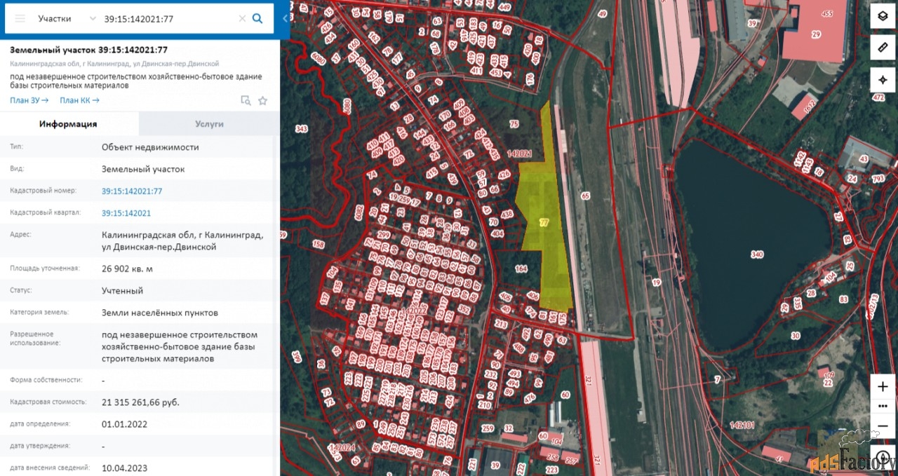 Арт. 75399642 <br>Предлагается к продаже земельный участок площадью 26902 м2, расположенный в квартале ул. Щаденко - ул. Двинская - пер. Двинской, в Московском районе г. Калининграда, недалеко от пруда Шенфлис и ж/д станции Дзержинская-Новая. <br>Согласно Генерального плана города Калининграда земельный участок находится в границах Коммунально-складской функциональной зоны, а согласно Правил землепользования и застройки (ПЗЗ) - в границах Коммунально-складской территориальной зоны (П-4), которая предусматривает широкий перечень основных видов разрешенного использования земельного участка и назначений объектов капитального строительства. <br> <br>Транспортная доступность к участку обеспечивается как со стороны Южного Обхода, так и со стороны центра городской агломерации г. Калининграда. К участку имеется подъезд с ул. Двинской. <br> <br>Поблизости расположены объекты промышленно-складского кластера и районы частной жилой застройки. <br> <br>Есть возможность выделения до 400 кВт электрической мощности. <br> <br>В наличии действующий ГПЗУ от 2024 года. <br> <br>Предлагаемый земельный участок позволит реализовать проекты строительства складских и прочих объектов делового назначения, что откроет новые возможности в развитии Вашего бизнеса! <br> <br>Полное юридическое сопровождение сделки и расчетов по ней. <br>Звоните, пишите, организуем показ в любое, удобное для вас время.