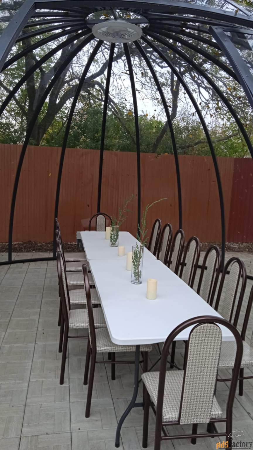 Все беседки оборудованы мебелью, электрокаминами, оригинальным освещением с вентиляцией, рядом имеются крытые мангальные зоны с освещением.