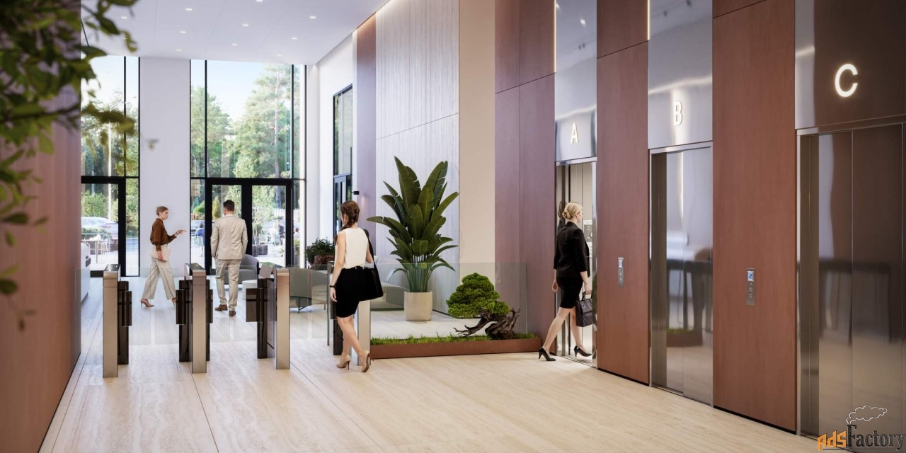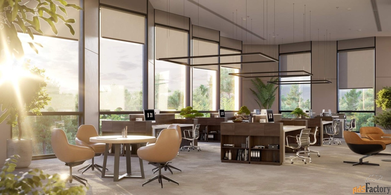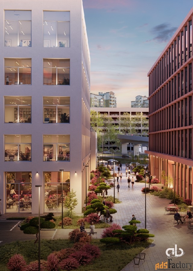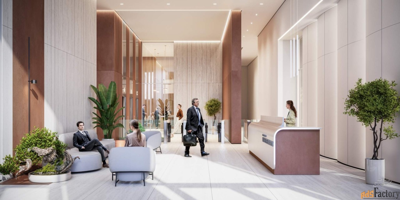 - На первых этажах офисных зданий просторные лобби с комфортной зоной ожидания, супермаркет, торговые помещения, отделения банков и сервисных служб, фитнес-студия