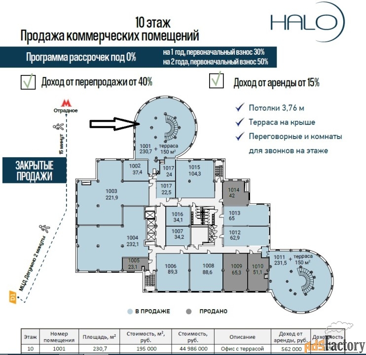 Старт продаж! Вашему вниманию предлагаю от СОБСТВЕННИКА! Офис площадью 230.7 кв. м на 10 этаже в НОВОМ МНОГОФУНЦИОНАЛЬНОМ КОМПЛЕКСЕ индустриального типа — ГАЛО! Помещение с панорамным видом и собственной террасой 150 кв. м. Расположенный: Алтуфьевское шоссе д. 35 к 1. Общая площадь объекта составляет 21 858 кв. м. Комбинация производственных, складских и офисных пространств обеспеченная необходимой инфраструктурой на одном этаже позволяет быстро реагировать на изменения рынка и потребности клиентов. В Гало каждый найдёт себе подходящее место! 10-этажное здание с продуманной системой логистики. Авто рампы с двух сторон для доступа транспорта на все этажи индустриального блока. Два грузовых бокса на уровне пола. Развитая инфраструктура для сотрудников: душевые, переговорные, комнаты для звонков. Универсальность пространства обеспечивается сочетанием производственных, складских и офисных площадей на одном этаже, что позволяет оперативно адаптироваться к рыночным изменениям. Проект предусматривает комфортную зеленую зону вокруг центра, дополненную новыми подъездами и паковочными местами. На крыше здания дополнительные пространства для отдыха и работы резидентов, что позволит наслаждаться видами на ВДНХ и Москва-Сити. Для удобства сотрудников в здании есть подземный паркинг с местами для мототранспорта и электрозарядные станции. Новый формат, способный удовлетворить потребности современного бизнеса в городской среде. Цены на этапе старте продаж. Специальные условия финансирования и рассрочка на покупку для инвесторов. Выгодная Рассрочка под 0% до двух лет.