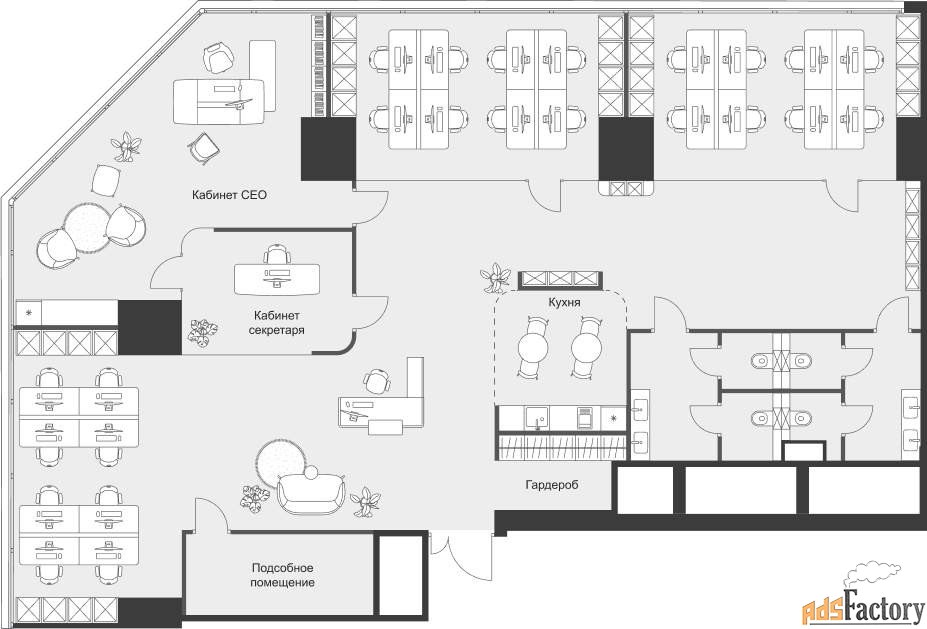 - Пространства без колонн в углах, идеально подходят для руководителей и современных команд.