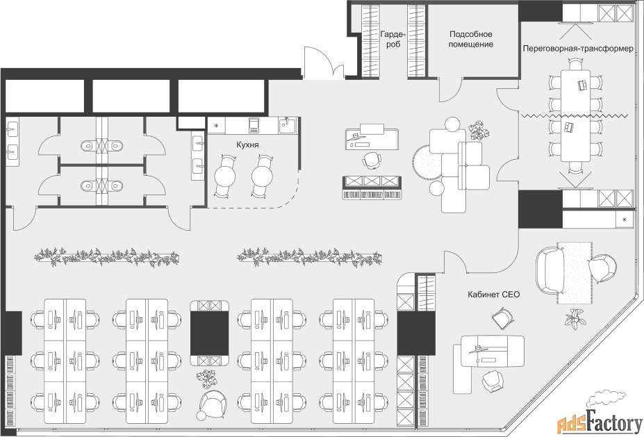 - Пространства без колонн в углах, идеально подходят для руководителей и современных команд.