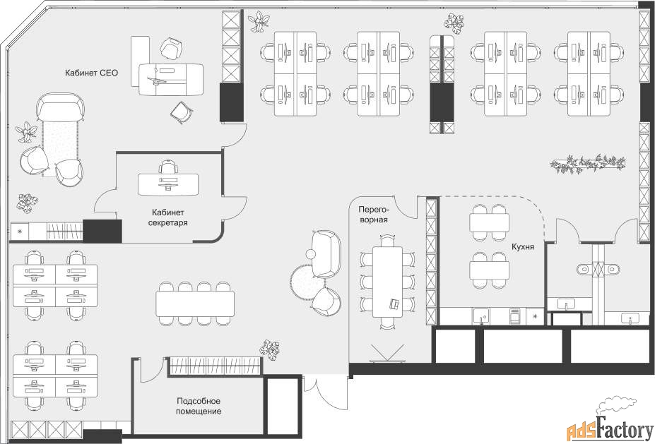 - Пространства без колонн в углах, идеально подходят для руководителей и современных команд.