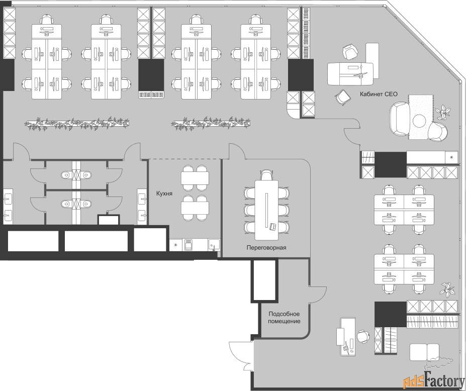 - Пространства без колонн в углах, идеально подходят для руководителей и современных команд.