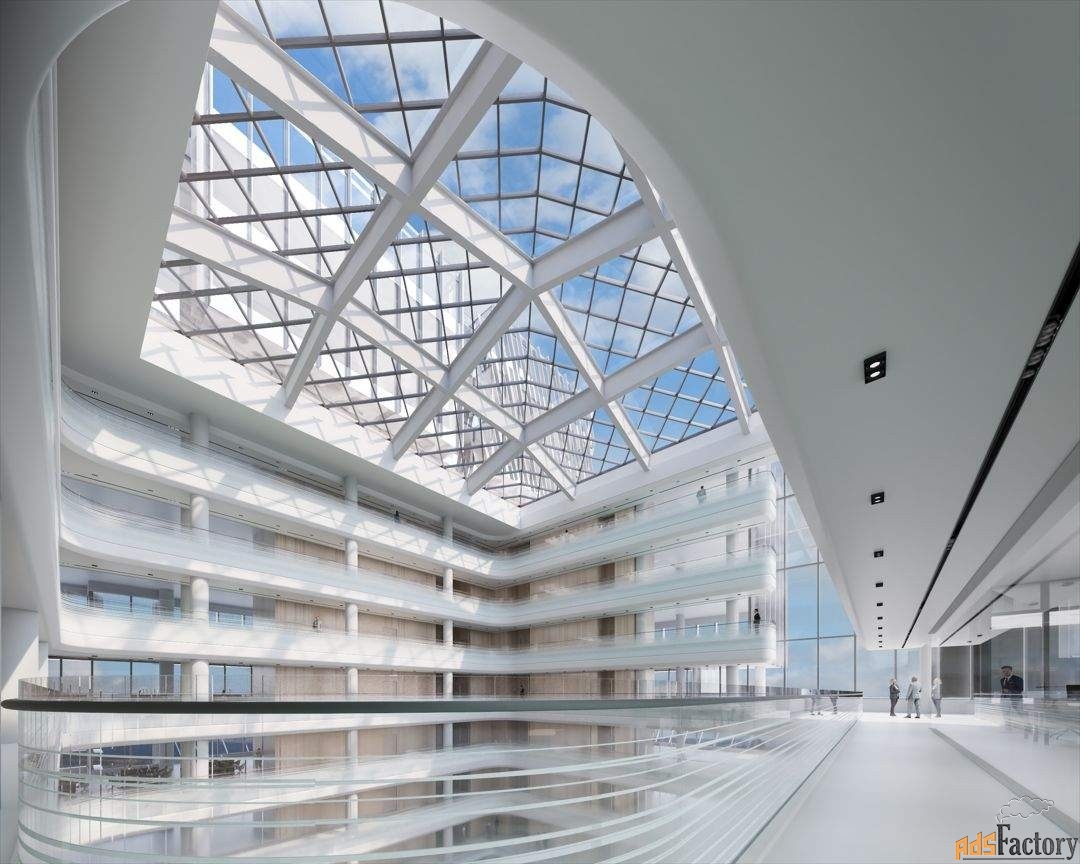 Авторская архитектура здания и просторный атриум создадут комфортную атмосферу для сотрудников и клиентов.