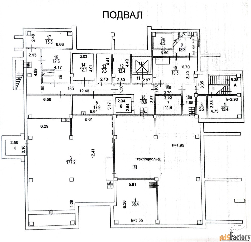 - Цокольный этаж: 440 м2, высота потолков 3,35 м. Здесь находятся венткамеры, подсобные помещения, санузлы и склады. Также есть грузовой подъемник, соединяющий цокольный этаж с 2-м этажом.