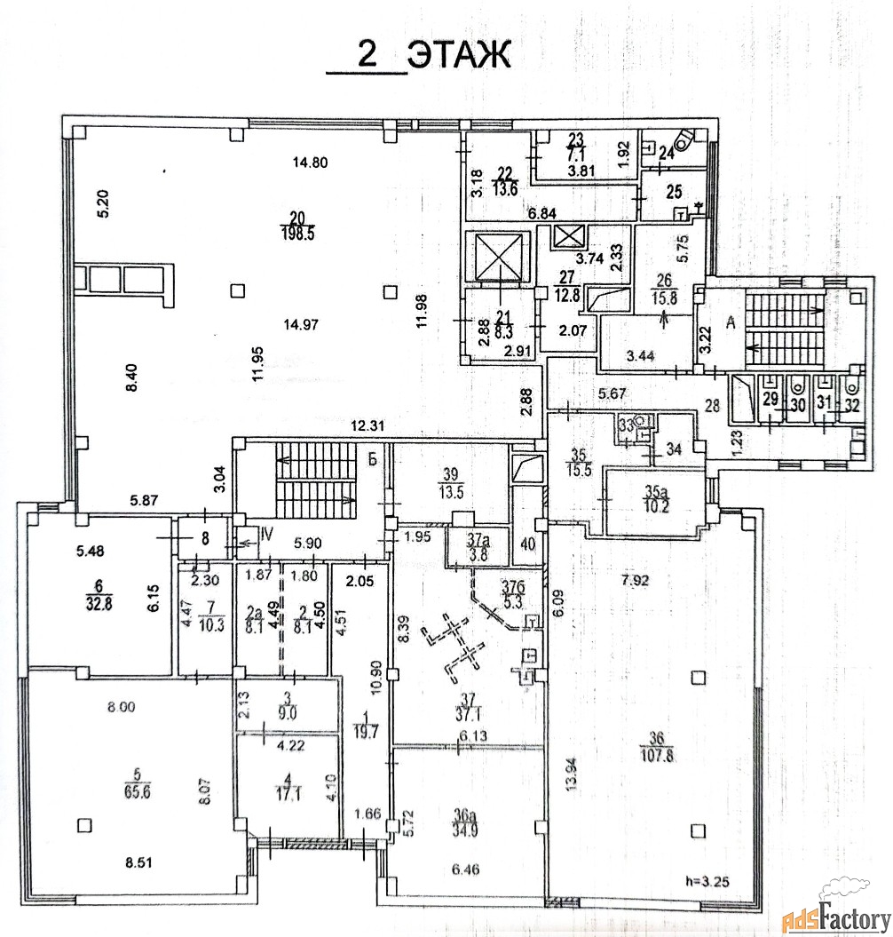 - 2-й этаж: 700 м2, высота потолков 3,25 м. Этаж имеет свободную планировку и используется под торговые залы.