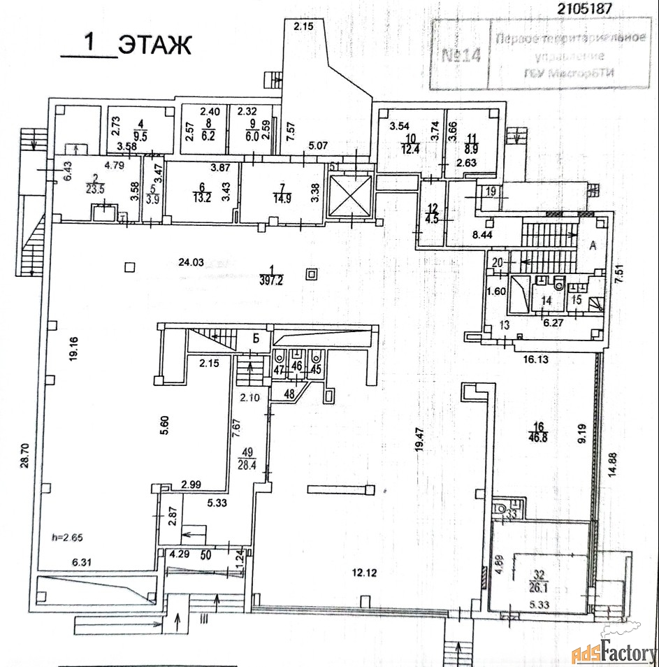 - 1-й этаж: 636 м2, высота потолков от 2,65 до 3,25 м. Этот этаж имеет свободную планировку и используется под торговые залы и склады. Здесь расположены четыре санузла.