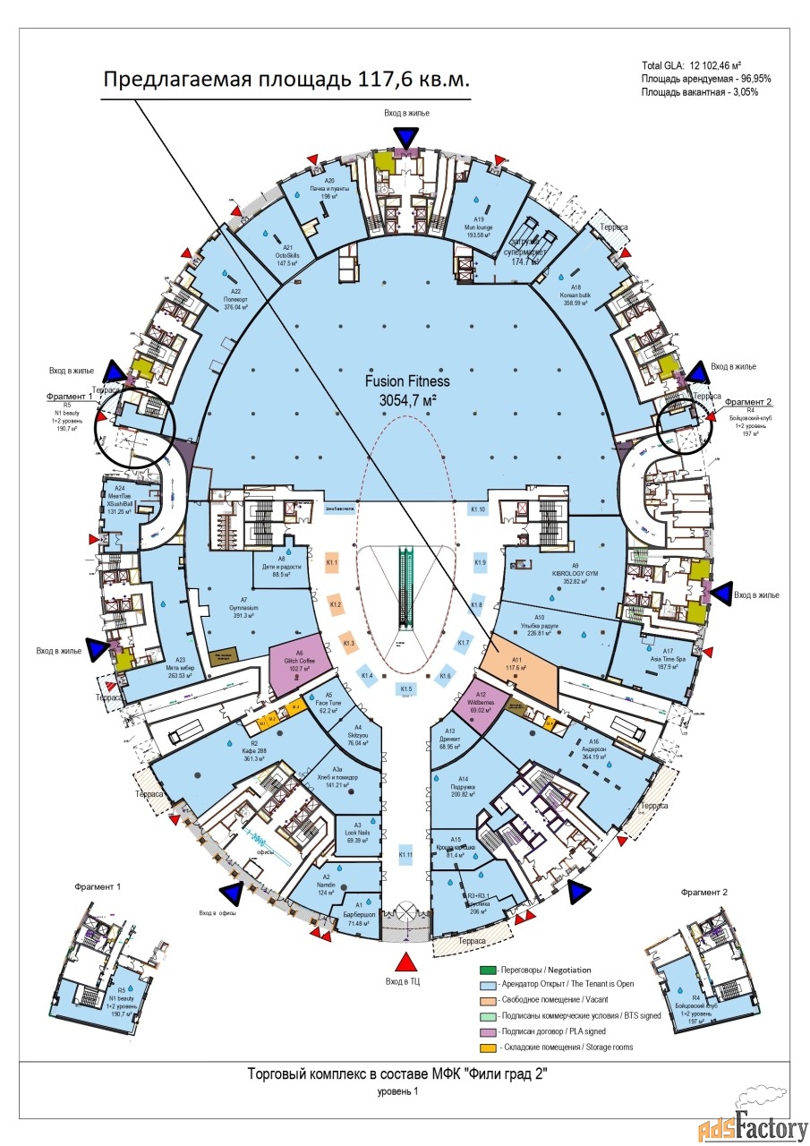 Возможное назначение помещения - шоурум, высота потолков 4.5 м, внутри типовой ремонт. Комнат в аренду - 1, на полу плитка. Общая площадь здания 18800 м2, здание работает с 10 до 22 ч., открыто ежедневно. Здание построено в 2017 году.