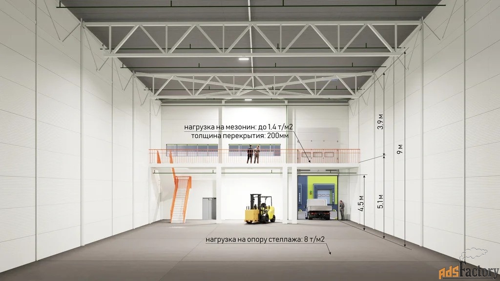 Модули в Корпусе 1 (класса В) высота 9м до ферм, площадь модуля от 684м2 до 5900м2(склад+мезонин)