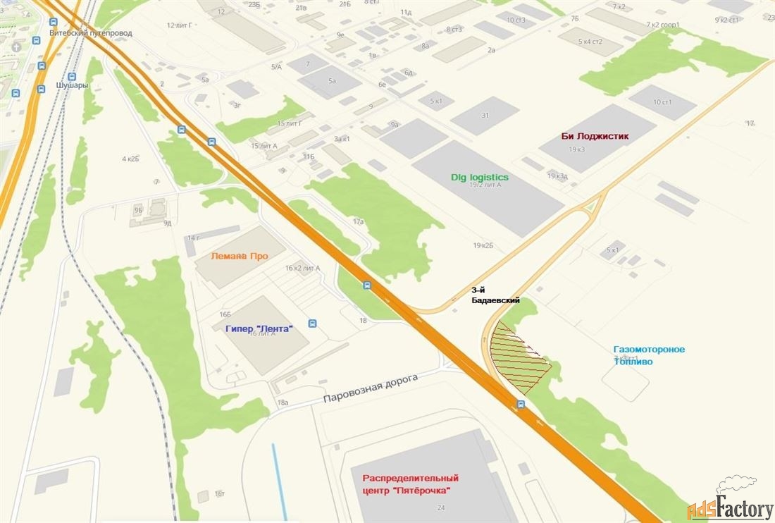 Примыкание к дороге - 1-я линия Московское шоссе, на стороне въезда в СПб, в 2 км от КАД, поворот на 3-й Бадаевский проезд