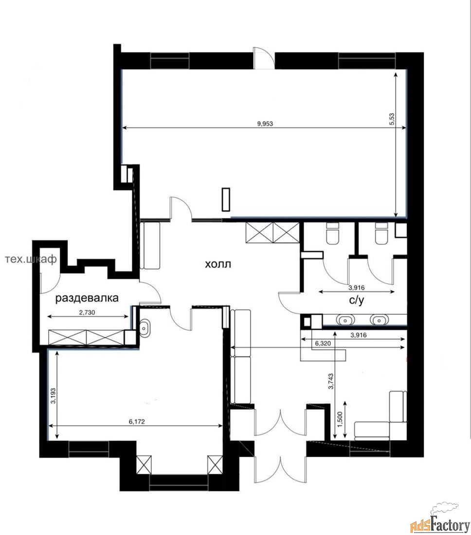 - потолок — выполнена шумоизоляция, отделка «Армстронг»,
