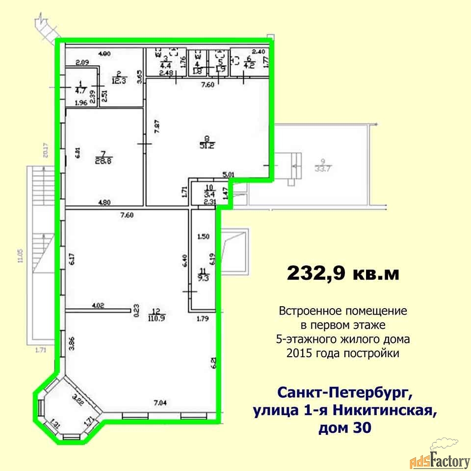 Встроенное помещение 233 кв.м расположено в первом этаже пятиэтажного жилого дома 2015 года постройки на 76 квартир, нежилой фонд, пять комнат, четыре санузла, отдельный вход, окна - на улицу, электричество - 40 кВт, потолки 3.31.