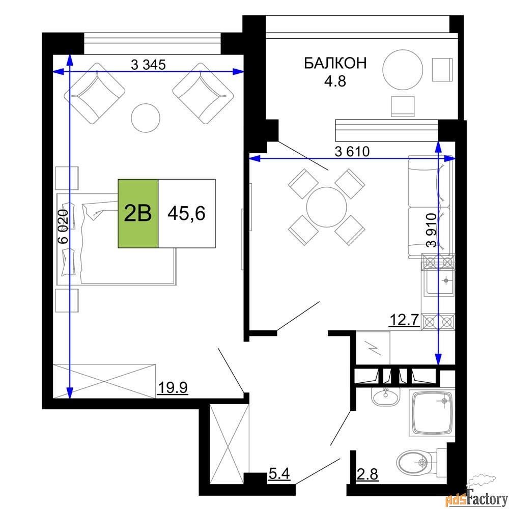 Жилая площадь 19.9 м2, кухня 12.7 м2, чистовая отделка с мебелью.
