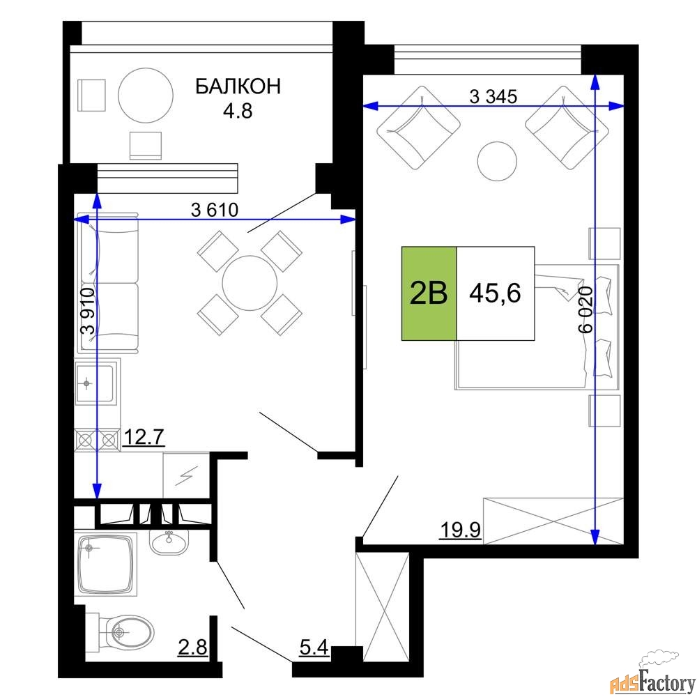 Жилая площадь 19.9 м2, кухня 12.7 м2, чистовая отделка с мебелью.