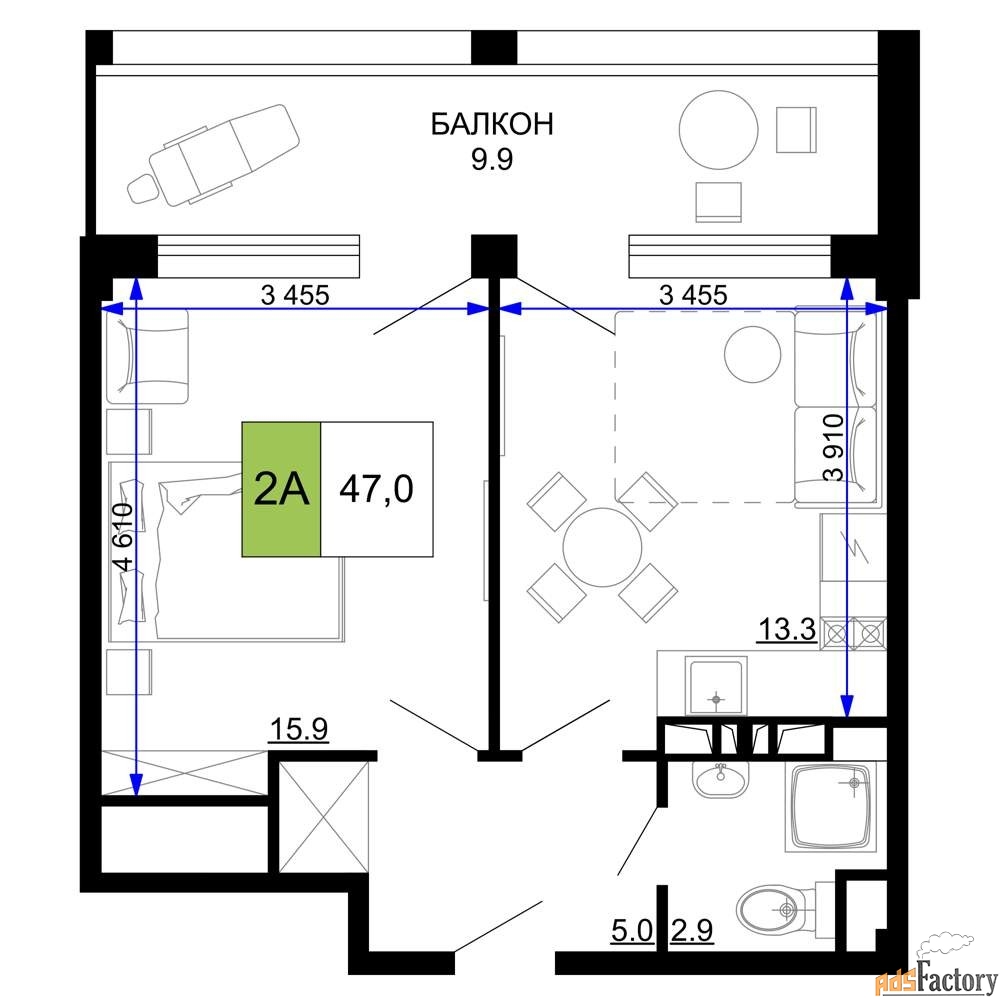 Жилая площадь 15.9 м2, кухня 13.3 м2, чистовая отделка с мебелью.