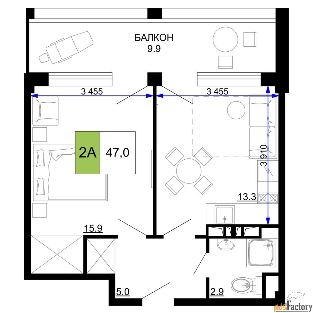 Жилая площадь 15.9 м2, кухня 13.3 м2, чистовая отделка с мебелью.