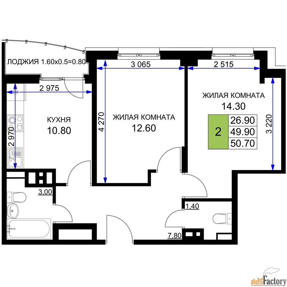 Жилая площадь 26.9 м2, кухня 10.8 м2, предчистовая отделка.
